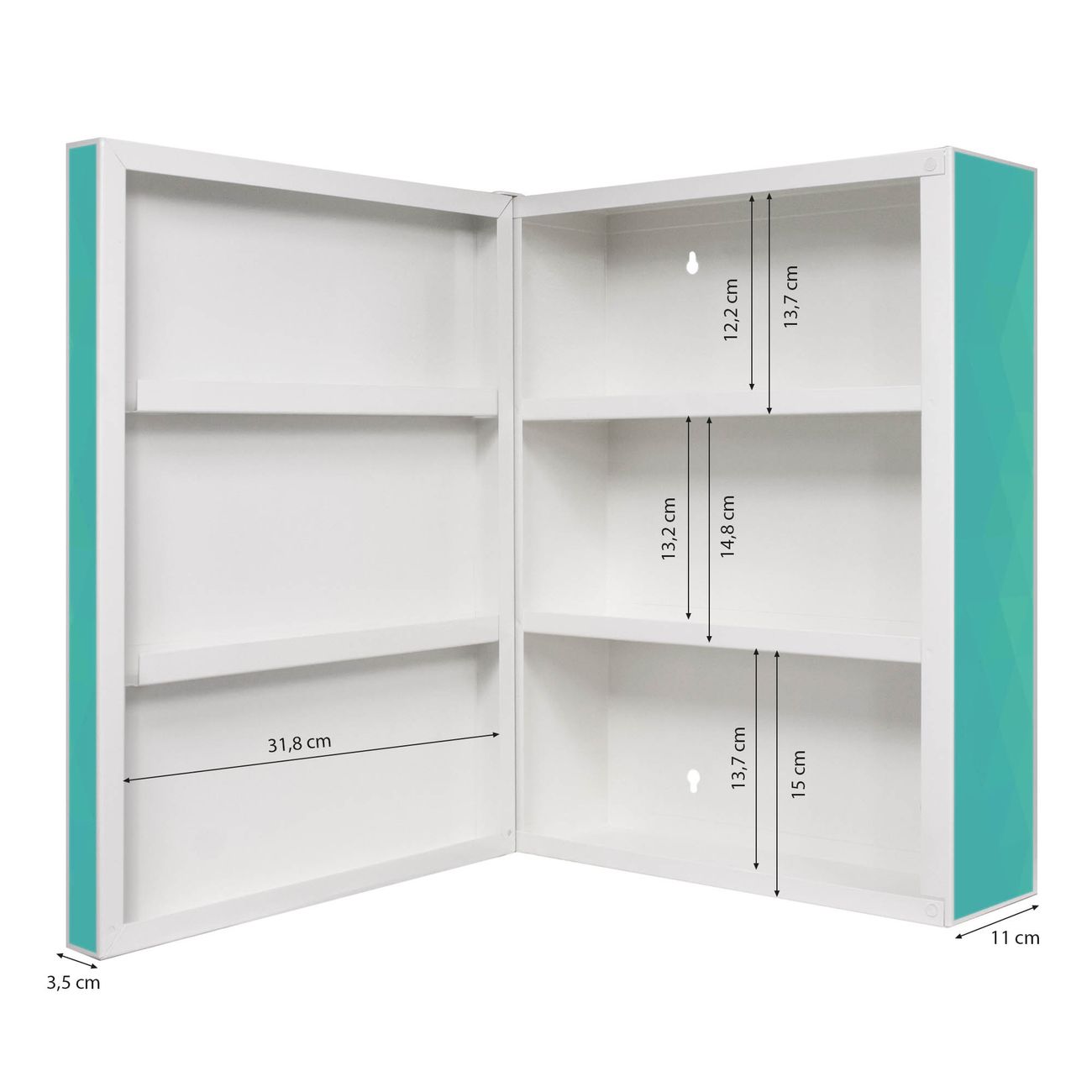 Der Medizinschrank ist gesamt 35x46x15cm groß und wiegt ca. 3900g. Der Türanschlag ist links und kann nicht verändert werden, die Fronttür öffnet ca. 115°. Die Folierung befindet sich auf der Front und den Seiten. Das Gehäuse ist zeitlos weiß und aus Stahl gefertigt. Die innenliegenden Fächer haben verschiedene Größen für unterschiedliche Aufbewahrungsmöglichkeiten, in der Innentür können ebenfalls Dinge abgelegt werden. Befestigt wird der Medizinschrank an 4 Stellen auf der Rückseite, Sie erhalten 3 Schlüssel.