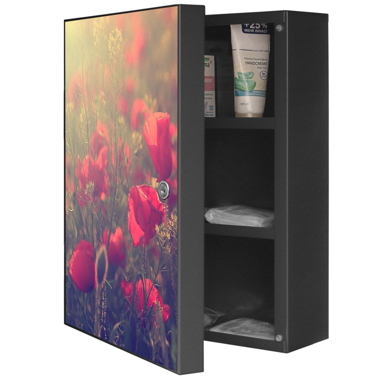 Der Medizinschrank ist gesamt 35x46x15cm groß und wiegt ca. 3900g. Der Türanschlag ist links und kann nicht verändert werden, die Fronttür öffnet ca. 115°. Die Folierung befindet sich auf der Front. Das Gehäuse ist zeitlos anthrazit und aus Stahl gefertigt. Die innenliegenden Fächer haben verschiedene Größen für unterschiedliche Aufbewahrungsmöglichkeiten, in der Innentür können ebenfalls Dinge abgelegt werden. Befestigt wird der Medizinschrank an 4 Stellen auf der Rückseite, Sie erhalten 3 Schlüssel.