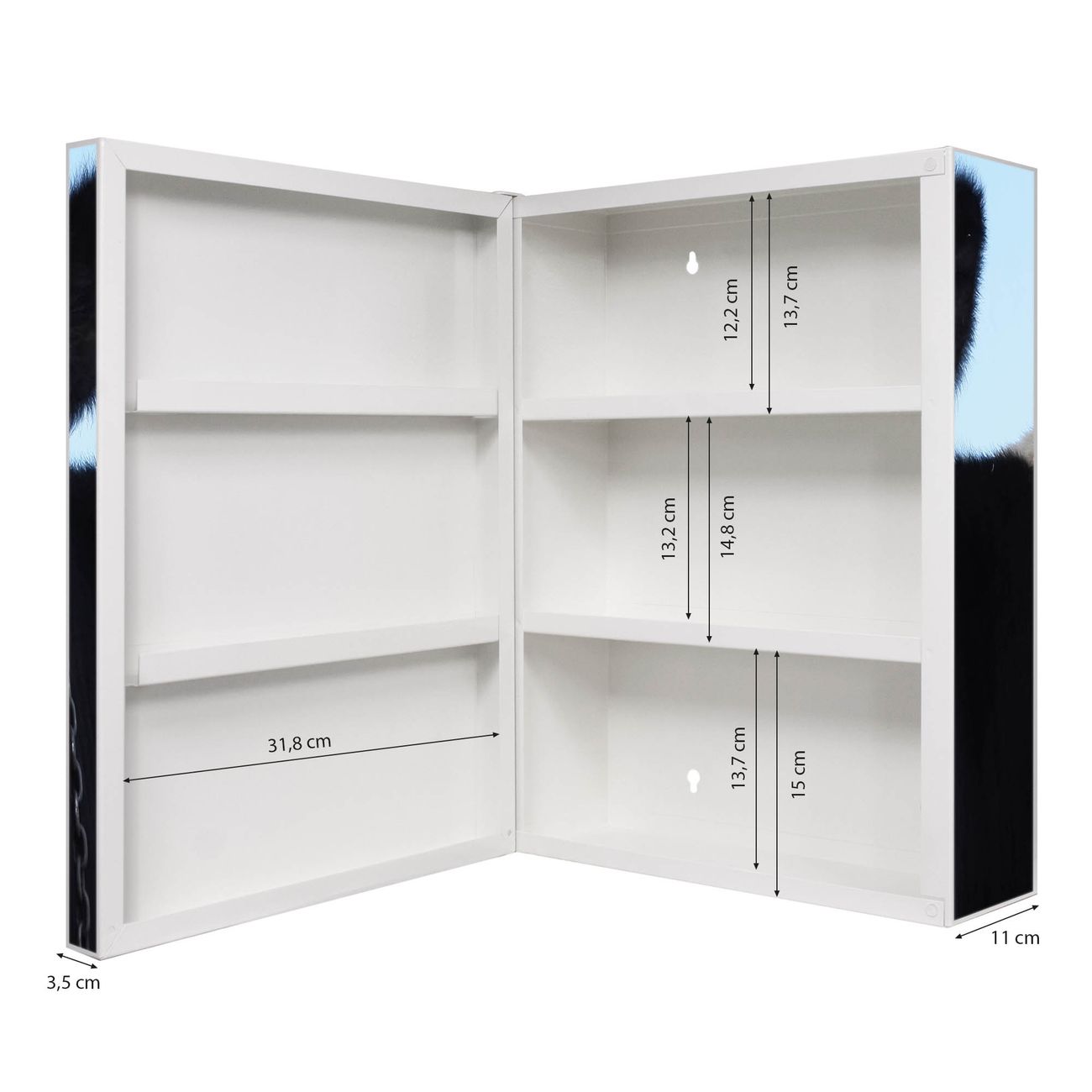 Der Medizinschrank ist gesamt 35x46x15cm groß und wiegt ca. 3900g. Der Türanschlag ist links und kann nicht verändert werden, die Fronttür öffnet ca. 115°. Die Folierung befindet sich auf der Front und den Seiten. Das Gehäuse ist zeitlos weiß und aus Stahl gefertigt. Die innenliegenden Fächer haben verschiedene Größen für unterschiedliche Aufbewahrungsmöglichkeiten, in der Innentür können ebenfalls Dinge abgelegt werden. Befestigt wird der Medizinschrank an 4 Stellen auf der Rückseite, Sie erhalten 3 Schlüssel.