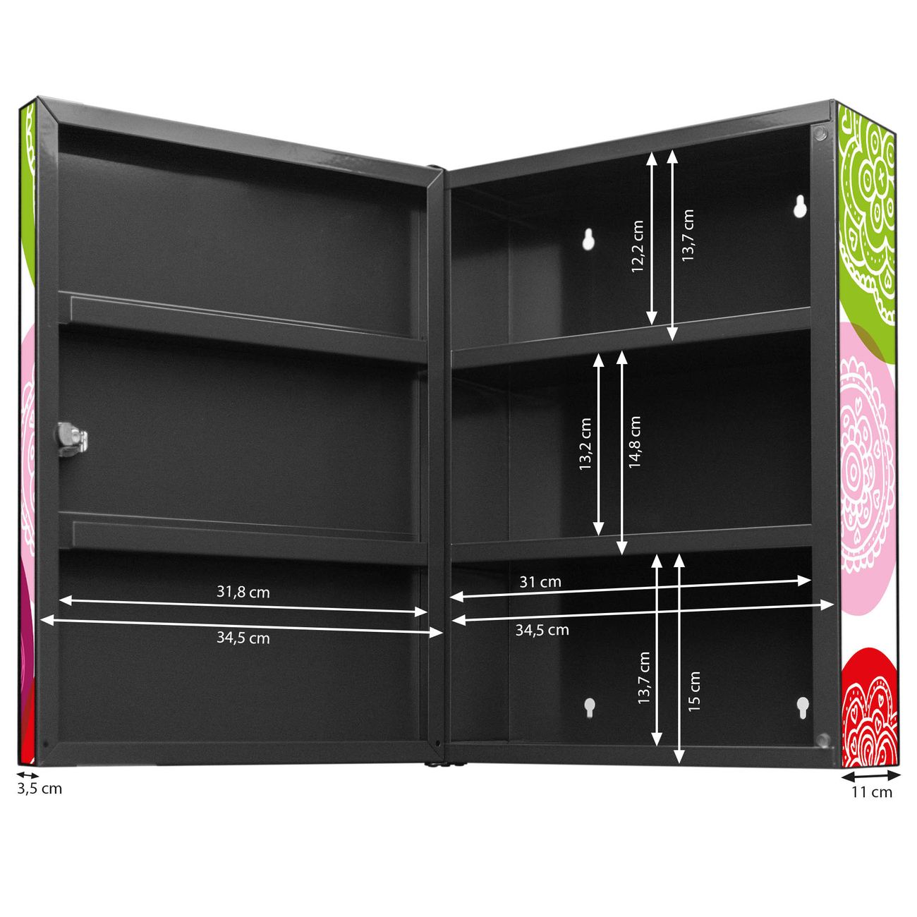 Der Medizinschrank ist gesamt 35x46x15cm groß und wiegt ca. 3900g. Der Türanschlag ist links und kann nicht verändert werden, die Fronttür öffnet ca. 115°. Die Folierung befindet sich auf der Front und den Seiten. Das Gehäuse ist zeitlos anthrazit und aus Stahl gefertigt. Die innenliegenden Fächer haben verschiedene Größen für unterschiedliche Aufbewahrungsmöglichkeiten, in der Innentür können ebenfalls Dinge abgelegt werden. Befestigt wird der Medizinschrank an 4 Stellen auf der Rückseite, Sie erhalten 3 Schlüssel.