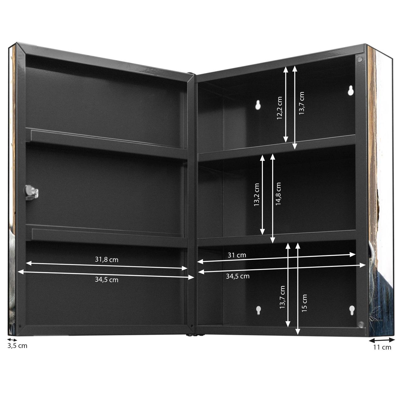 Der Medizinschrank ist gesamt 35x46x15cm groß und wiegt ca. 3900g. Der Türanschlag ist links und kann nicht verändert werden, die Fronttür öffnet ca. 115°. Die Folierung befindet sich auf der Front und den Seiten. Das Gehäuse ist zeitlos anthrazit und aus Stahl gefertigt. Die innenliegenden Fächer haben verschiedene Größen für unterschiedliche Aufbewahrungsmöglichkeiten, in der Innentür können ebenfalls Dinge abgelegt werden. Befestigt wird der Medizinschrank an 4 Stellen auf der Rückseite, Sie erhalten 3 Schlüssel.