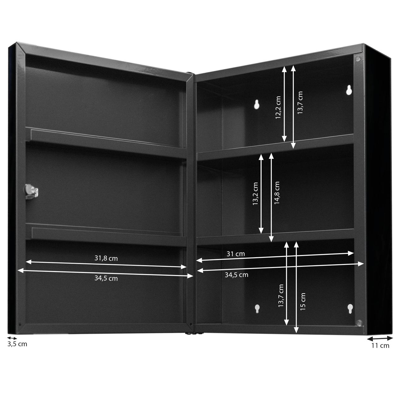 Der Medizinschrank ist gesamt 35x46x15cm groß und wiegt ca. 3900g. Der Türanschlag ist links und kann nicht verändert werden, die Fronttür öffnet ca. 115°. Die Folierung befindet sich auf der Front und den Seiten. Das Gehäuse ist zeitlos anthrazit und aus Stahl gefertigt. Die innenliegenden Fächer haben verschiedene Größen für unterschiedliche Aufbewahrungsmöglichkeiten, in der Innentür können ebenfalls Dinge abgelegt werden. Befestigt wird der Medizinschrank an 4 Stellen auf der Rückseite, Sie erhalten 3 Schlüssel.