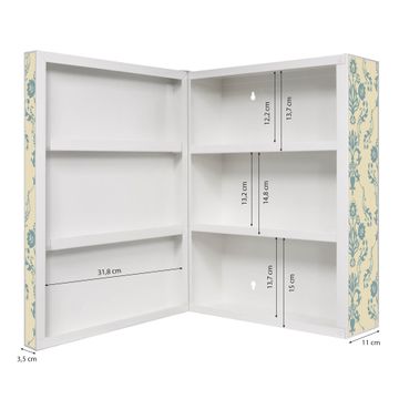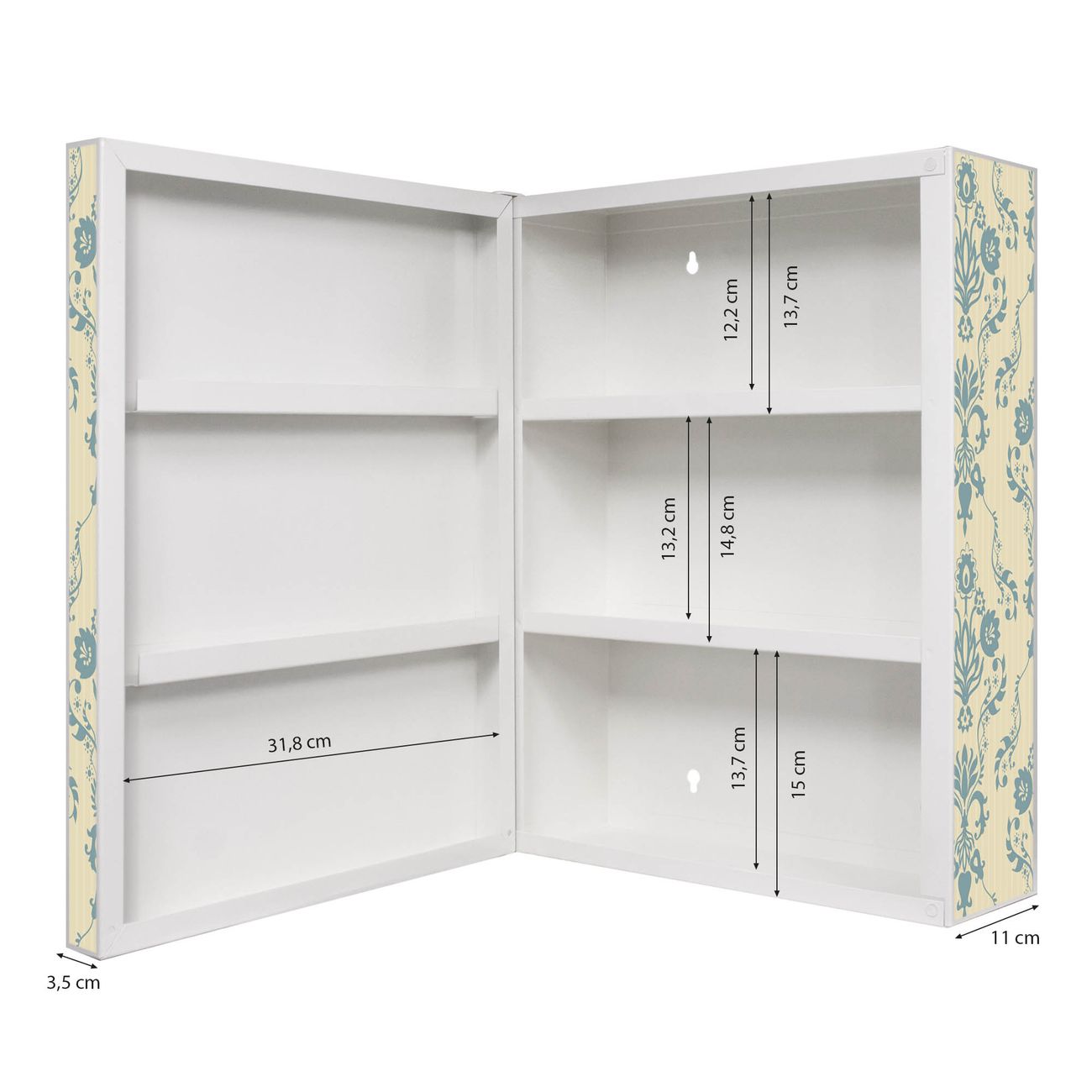 Der Medizinschrank ist gesamt 35x46x15cm groß und wiegt ca. 3900g. Der Türanschlag ist links und kann nicht verändert werden, die Fronttür öffnet ca. 115°. Die Folierung befindet sich auf der Front und den Seiten. Das Gehäuse ist zeitlos weiß und aus Stahl gefertigt. Die innenliegenden Fächer haben verschiedene Größen für unterschiedliche Aufbewahrungsmöglichkeiten, in der Innentür können ebenfalls Dinge abgelegt werden. Befestigt wird der Medizinschrank an 4 Stellen auf der Rückseite, Sie erhalten 3 Schlüssel.