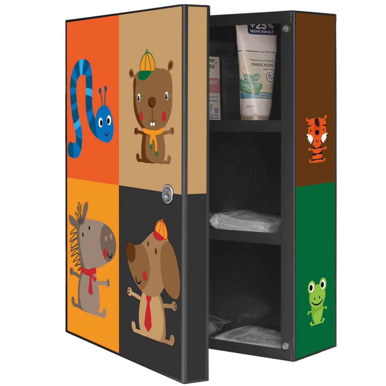 Der Medizinschrank ist gesamt 35x46x15cm groß und wiegt ca. 3900g. Der Türanschlag ist links und kann nicht verändert werden, die Fronttür öffnet ca. 115°. Die Folierung befindet sich auf der Front und den Seiten. Das Gehäuse ist zeitlos anthrazit und aus Stahl gefertigt. Die innenliegenden Fächer haben verschiedene Größen für unterschiedliche Aufbewahrungsmöglichkeiten, in der Innentür können ebenfalls Dinge abgelegt werden. Befestigt wird der Medizinschrank an 4 Stellen auf der Rückseite, Sie erhalten 3 Schlüssel.