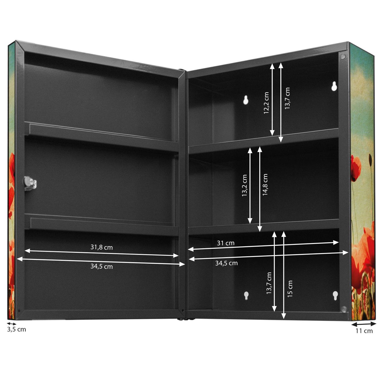 Der Medizinschrank ist gesamt 35x46x15cm groß und wiegt ca. 3900g. Der Türanschlag ist links und kann nicht verändert werden, die Fronttür öffnet ca. 115°. Die Folierung befindet sich auf der Front und den Seiten. Das Gehäuse ist zeitlos anthrazit und aus Stahl gefertigt. Die innenliegenden Fächer haben verschiedene Größen für unterschiedliche Aufbewahrungsmöglichkeiten, in der Innentür können ebenfalls Dinge abgelegt werden. Befestigt wird der Medizinschrank an 4 Stellen auf der Rückseite, Sie erhalten 3 Schlüssel.