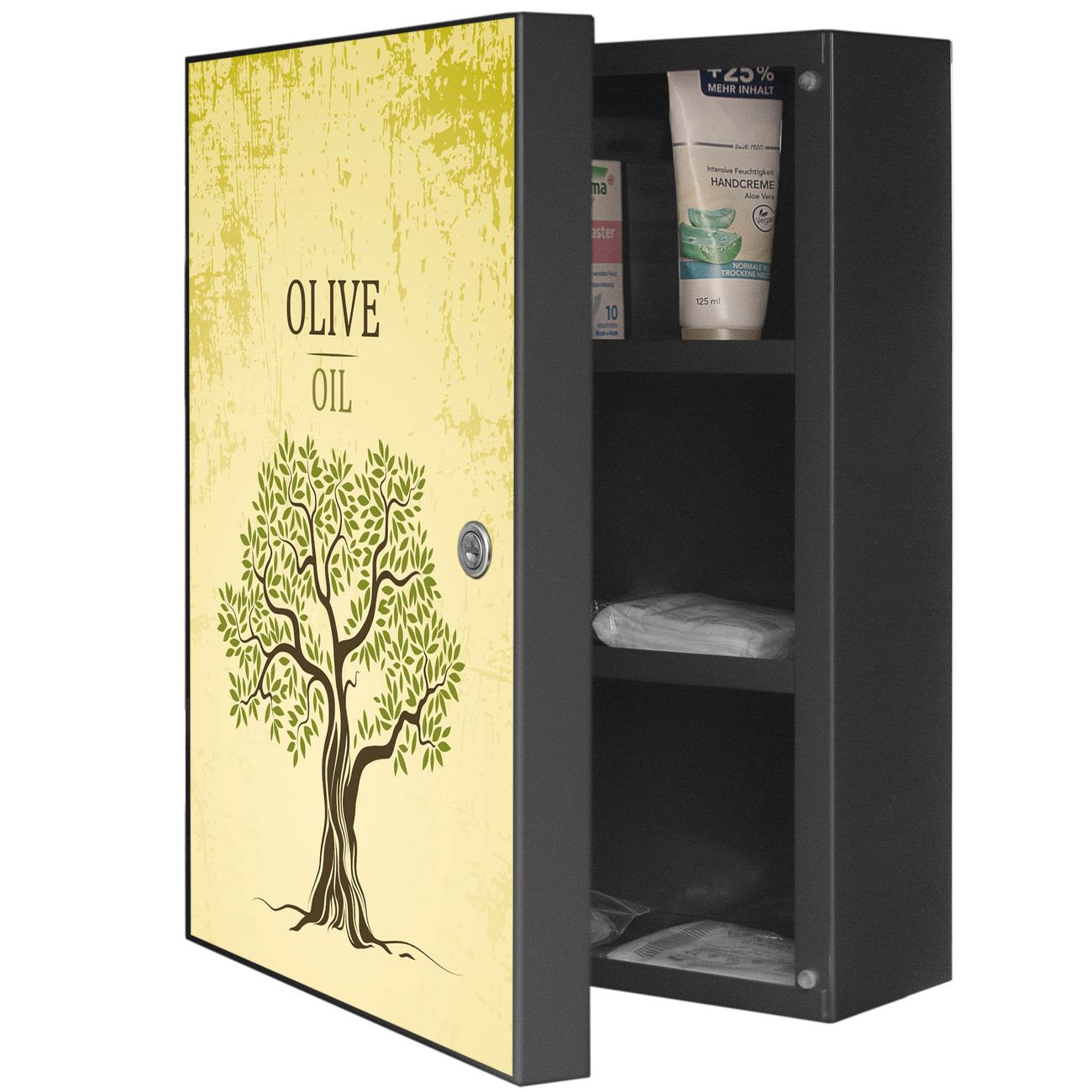 Der Medizinschrank ist gesamt 35x46x15cm groß und wiegt ca. 3900g. Der Türanschlag ist links und kann nicht verändert werden, die Fronttür öffnet ca. 115°. Die Folierung befindet sich auf der Front. Das Gehäuse ist zeitlos anthrazit und aus Stahl gefertigt. Die innenliegenden Fächer haben verschiedene Größen für unterschiedliche Aufbewahrungsmöglichkeiten, in der Innentür können ebenfalls Dinge abgelegt werden. Befestigt wird der Medizinschrank an 4 Stellen auf der Rückseite, Sie erhalten 3 Schlüssel.
