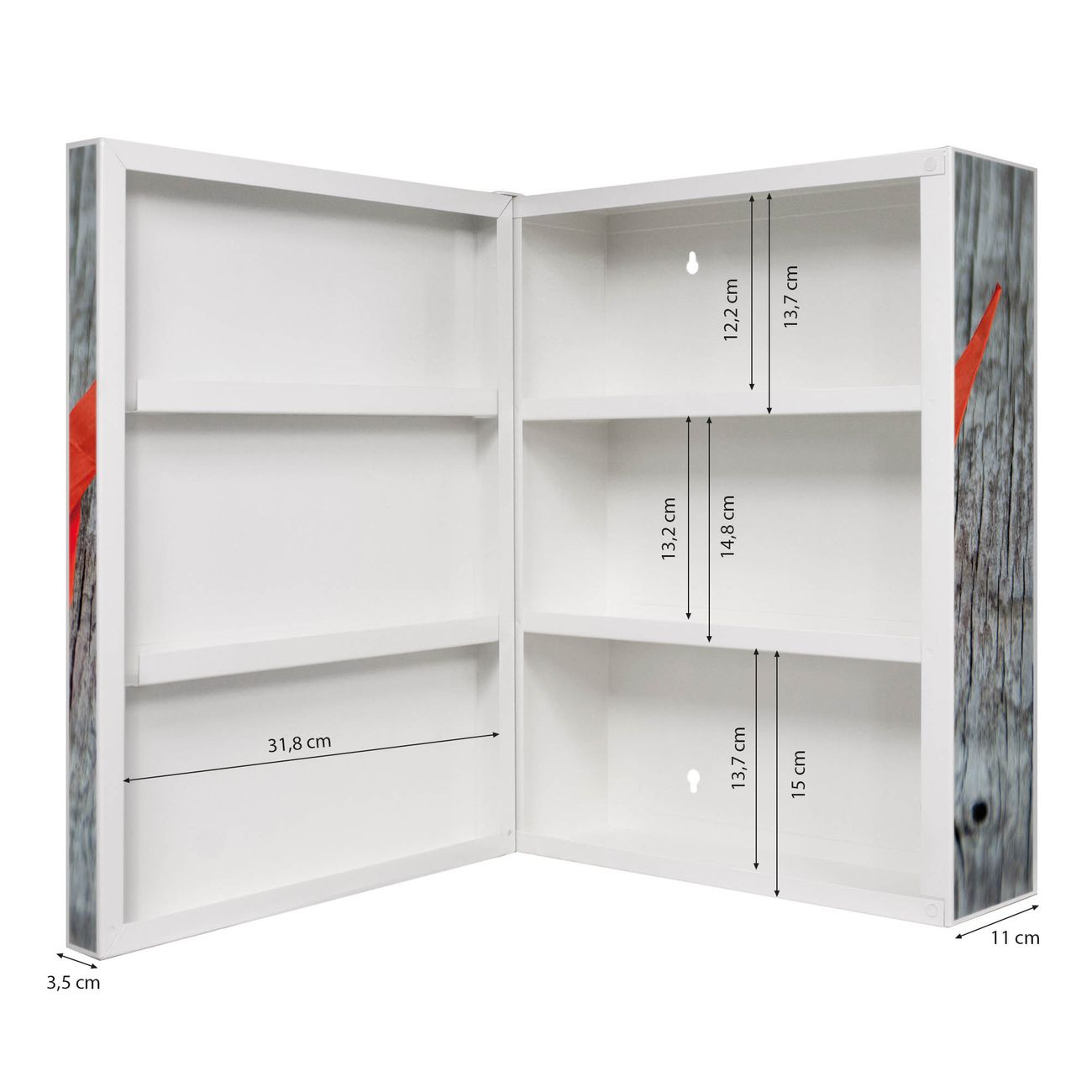 Der Medizinschrank ist gesamt 35x46x15cm groß und wiegt ca. 3900g. Der Türanschlag ist links und kann nicht verändert werden, die Fronttür öffnet ca. 115°. Die Folierung befindet sich auf der Front und den Seiten. Das Gehäuse ist zeitlos weiß und aus Stahl gefertigt. Die innenliegenden Fächer haben verschiedene Größen für unterschiedliche Aufbewahrungsmöglichkeiten, in der Innentür können ebenfalls Dinge abgelegt werden. Befestigt wird der Medizinschrank an 4 Stellen auf der Rückseite, Sie erhalten 3 Schlüssel.