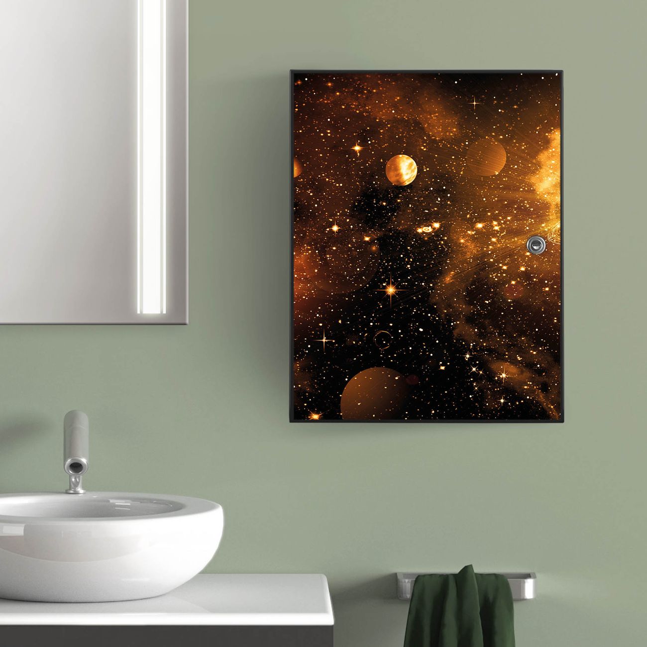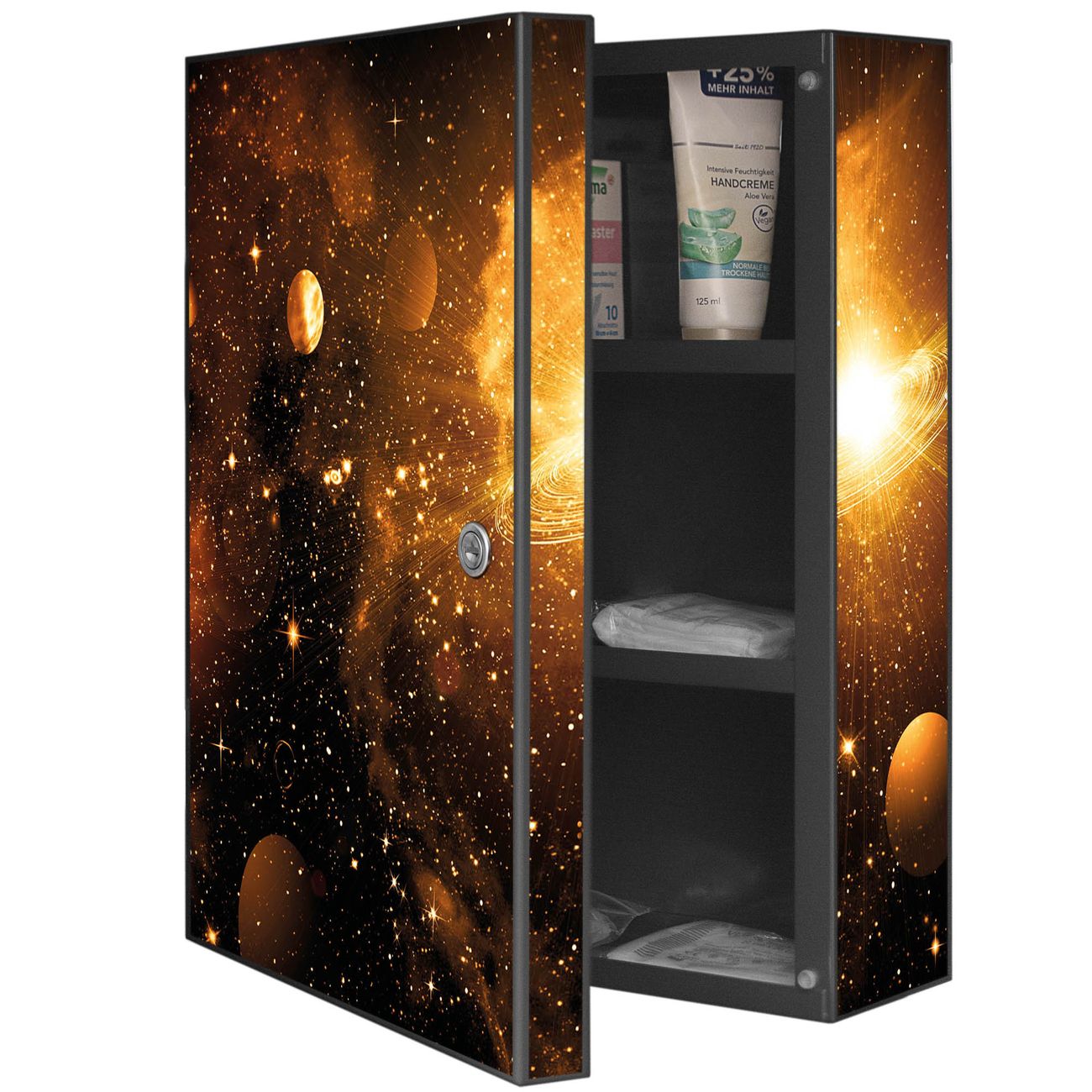 Der Medizinschrank ist gesamt 35x46x15cm groß und wiegt ca. 3900g. Der Türanschlag ist links und kann nicht verändert werden, die Fronttür öffnet ca. 115°. Die Folierung befindet sich auf der Front und den Seiten. Das Gehäuse ist zeitlos anthrazit und aus Stahl gefertigt. Die innenliegenden Fächer haben verschiedene Größen für unterschiedliche Aufbewahrungsmöglichkeiten, in der Innentür können ebenfalls Dinge abgelegt werden. Befestigt wird der Medizinschrank an 4 Stellen auf der Rückseite, Sie erhalten 3 Schlüssel.