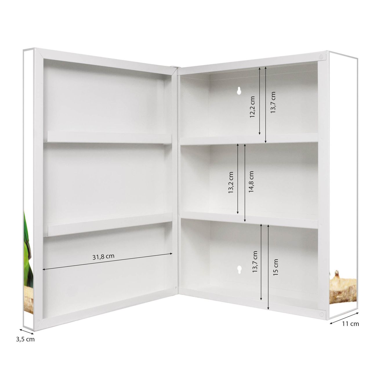 Der Medizinschrank ist gesamt 35x46x15cm groß und wiegt ca. 3900g. Der Türanschlag ist links und kann nicht verändert werden, die Fronttür öffnet ca. 115°. Die Folierung befindet sich auf der Front und den Seiten. Das Gehäuse ist zeitlos weiß und aus Stahl gefertigt. Die innenliegenden Fächer haben verschiedene Größen für unterschiedliche Aufbewahrungsmöglichkeiten, in der Innentür können ebenfalls Dinge abgelegt werden. Befestigt wird der Medizinschrank an 4 Stellen auf der Rückseite, Sie erhalten 3 Schlüssel.