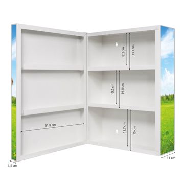 Der Medizinschrank ist gesamt 35x46x15cm groß und wiegt ca. 3900g. Der Türanschlag ist links und kann nicht verändert werden, die Fronttür öffnet ca. 115°. Die Folierung befindet sich auf der Front und den Seiten. Das Gehäuse ist zeitlos weiß und aus Stahl gefertigt. Die innenliegenden Fächer haben verschiedene Größen für unterschiedliche Aufbewahrungsmöglichkeiten, in der Innentür können ebenfalls Dinge abgelegt werden. Befestigt wird der Medizinschrank an 4 Stellen auf der Rückseite, Sie erhalten 3 Schlüssel.