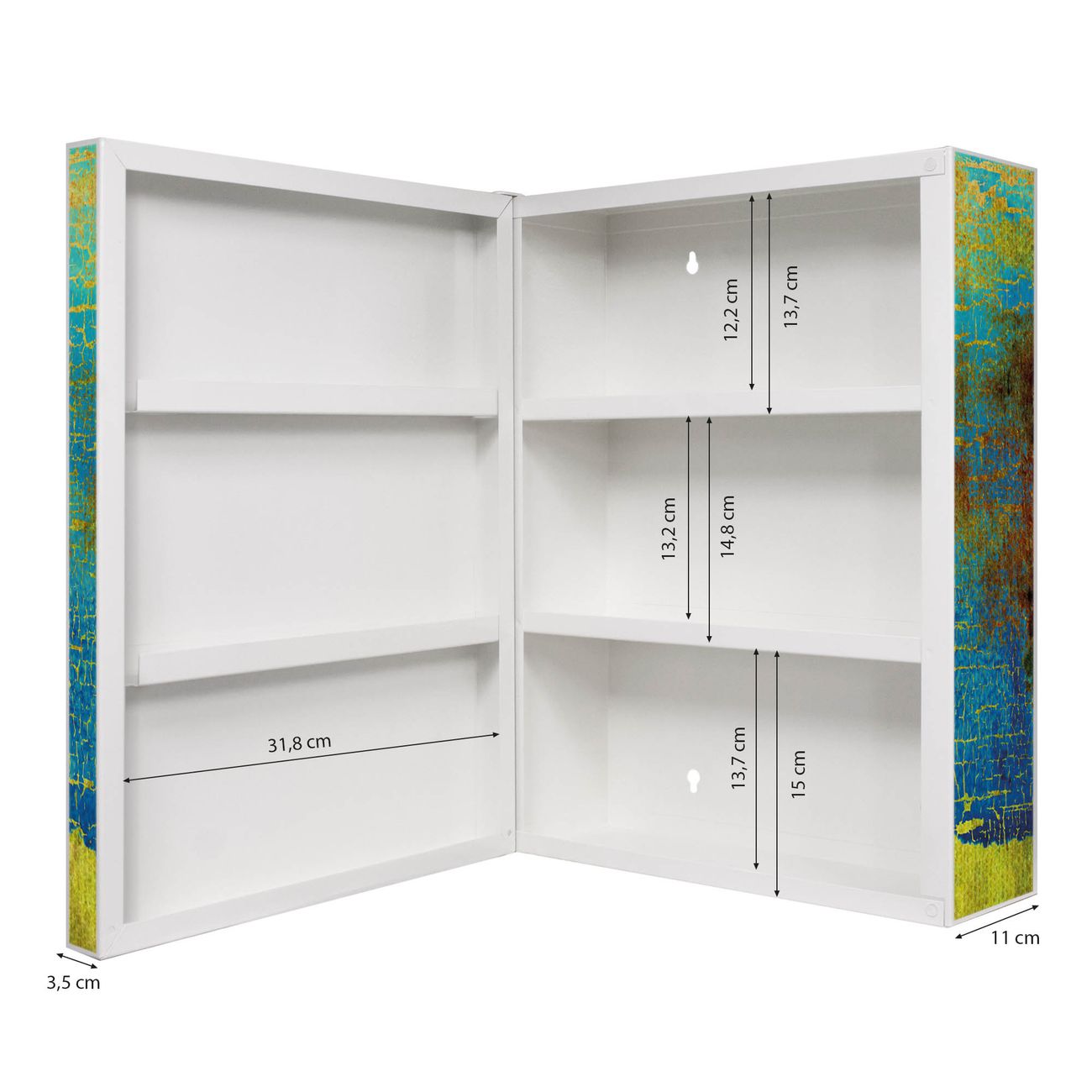 Der Medizinschrank ist gesamt 35x46x15cm groß und wiegt ca. 3900g. Der Türanschlag ist links und kann nicht verändert werden, die Fronttür öffnet ca. 115°. Die Folierung befindet sich auf der Front und den Seiten. Das Gehäuse ist zeitlos weiß und aus Stahl gefertigt. Die innenliegenden Fächer haben verschiedene Größen für unterschiedliche Aufbewahrungsmöglichkeiten, in der Innentür können ebenfalls Dinge abgelegt werden. Befestigt wird der Medizinschrank an 4 Stellen auf der Rückseite, Sie erhalten 3 Schlüssel.