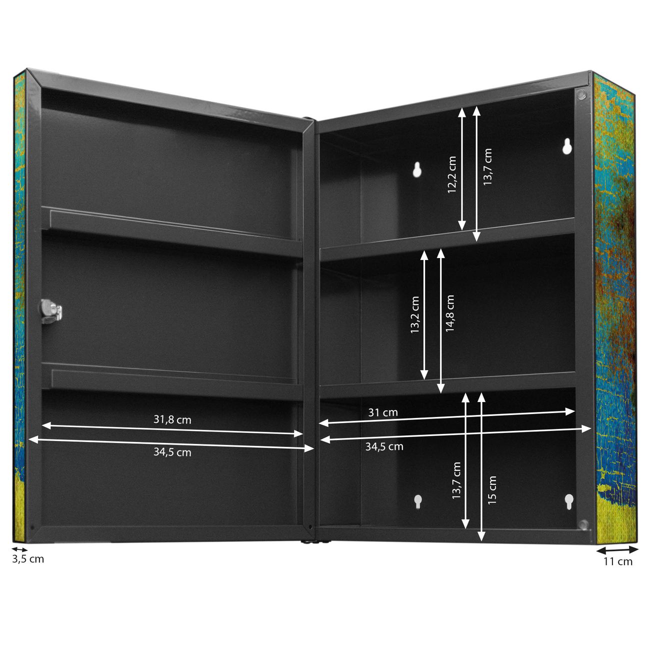 Der Medizinschrank ist gesamt 35x46x15cm groß und wiegt ca. 3900g. Der Türanschlag ist links und kann nicht verändert werden, die Fronttür öffnet ca. 115°. Die Folierung befindet sich auf der Front und den Seiten. Das Gehäuse ist zeitlos anthrazit und aus Stahl gefertigt. Die innenliegenden Fächer haben verschiedene Größen für unterschiedliche Aufbewahrungsmöglichkeiten, in der Innentür können ebenfalls Dinge abgelegt werden. Befestigt wird der Medizinschrank an 4 Stellen auf der Rückseite, Sie erhalten 3 Schlüssel.