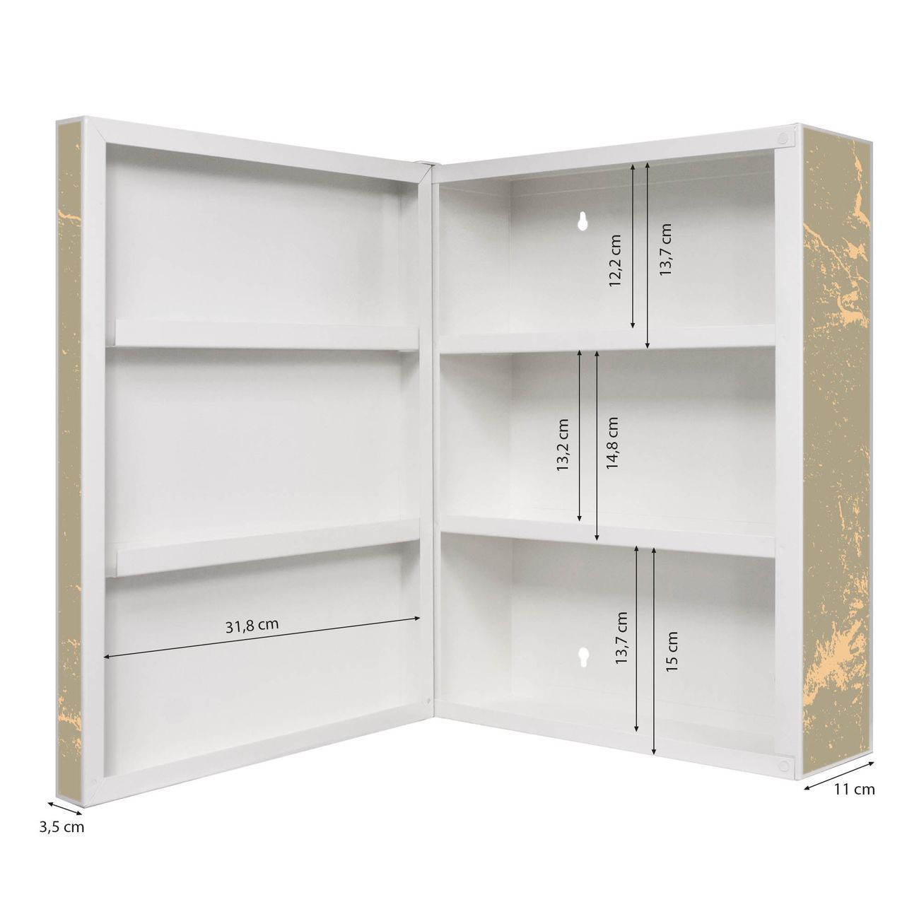 Der Medizinschrank ist gesamt 35x46x15cm groß und wiegt ca. 3900g. Der Türanschlag ist links und kann nicht verändert werden, die Fronttür öffnet ca. 115°. Die Folierung befindet sich auf der Front und den Seiten. Das Gehäuse ist zeitlos weiß und aus Stahl gefertigt. Die innenliegenden Fächer haben verschiedene Größen für unterschiedliche Aufbewahrungsmöglichkeiten, in der Innentür können ebenfalls Dinge abgelegt werden. Befestigt wird der Medizinschrank an 4 Stellen auf der Rückseite, Sie erhalten 3 Schlüssel.