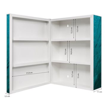 Der Medizinschrank ist gesamt 35x46x15cm groß und wiegt ca. 3900g. Der Türanschlag ist links und kann nicht verändert werden, die Fronttür öffnet ca. 115°. Die Folierung befindet sich auf der Front und den Seiten. Das Gehäuse ist zeitlos weiß und aus Stahl gefertigt. Die innenliegenden Fächer haben verschiedene Größen für unterschiedliche Aufbewahrungsmöglichkeiten, in der Innentür können ebenfalls Dinge abgelegt werden. Befestigt wird der Medizinschrank an 4 Stellen auf der Rückseite, Sie erhalten 3 Schlüssel.