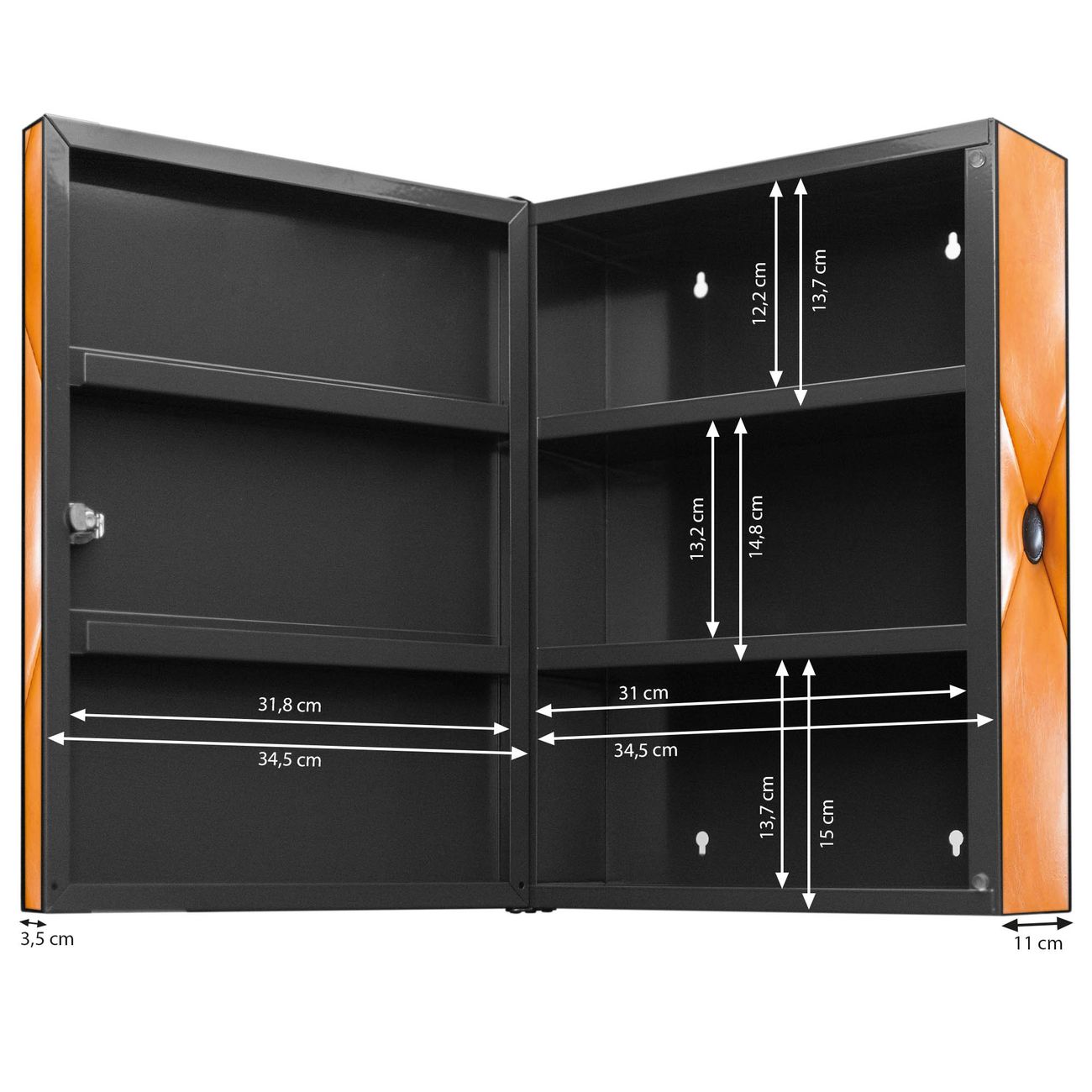 Der Medizinschrank ist gesamt 35x46x15cm groß und wiegt ca. 3900g. Der Türanschlag ist links und kann nicht verändert werden, die Fronttür öffnet ca. 115°. Die Folierung befindet sich auf der Front und den Seiten. Das Gehäuse ist zeitlos anthrazit und aus Stahl gefertigt. Die innenliegenden Fächer haben verschiedene Größen für unterschiedliche Aufbewahrungsmöglichkeiten, in der Innentür können ebenfalls Dinge abgelegt werden. Befestigt wird der Medizinschrank an 4 Stellen auf der Rückseite, Sie erhalten 3 Schlüssel.