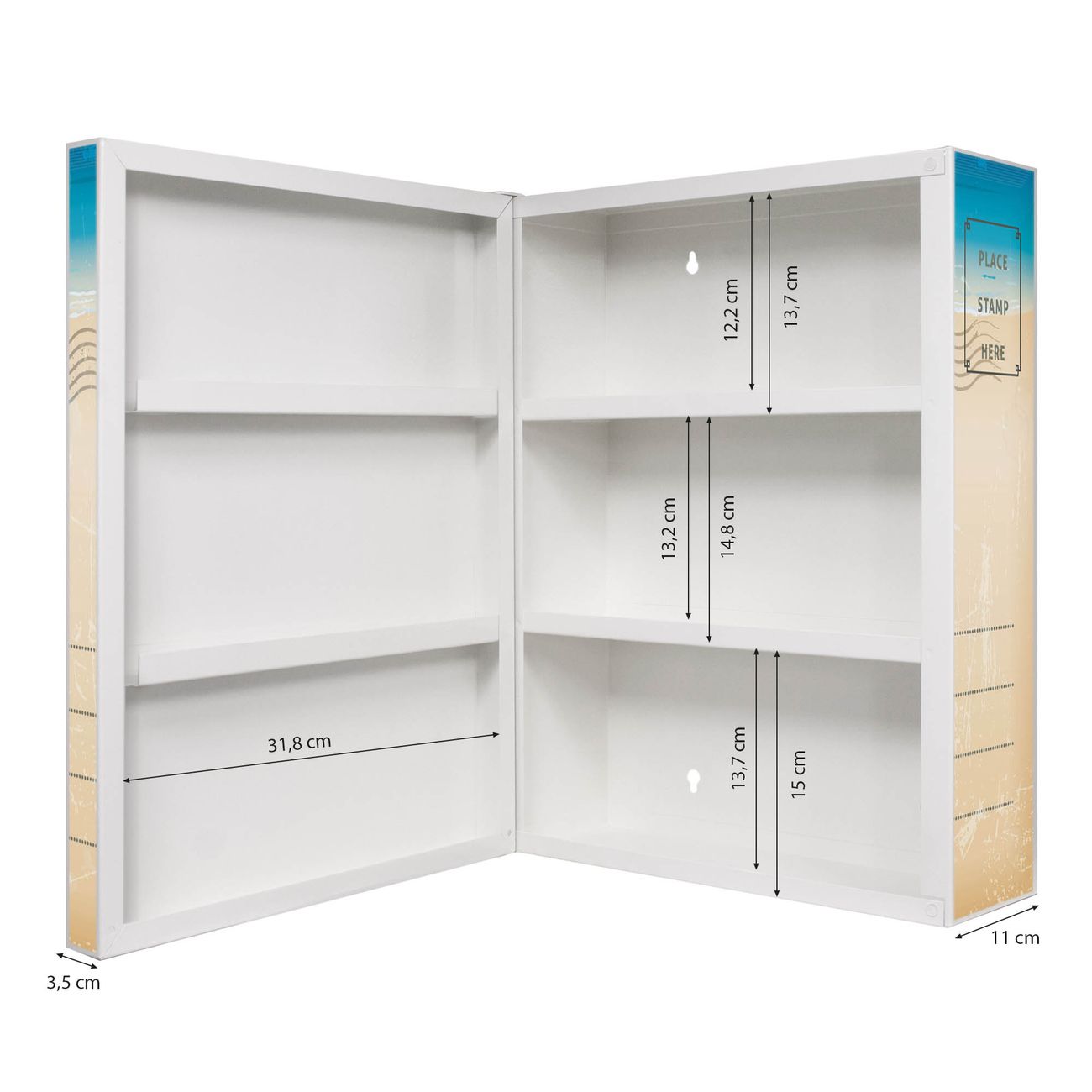 Der Medizinschrank ist gesamt 35x46x15cm groß und wiegt ca. 3900g. Der Türanschlag ist links und kann nicht verändert werden, die Fronttür öffnet ca. 115°. Die Folierung befindet sich auf der Front und den Seiten. Das Gehäuse ist zeitlos weiß und aus Stahl gefertigt. Die innenliegenden Fächer haben verschiedene Größen für unterschiedliche Aufbewahrungsmöglichkeiten, in der Innentür können ebenfalls Dinge abgelegt werden. Befestigt wird der Medizinschrank an 4 Stellen auf der Rückseite, Sie erhalten 3 Schlüssel.