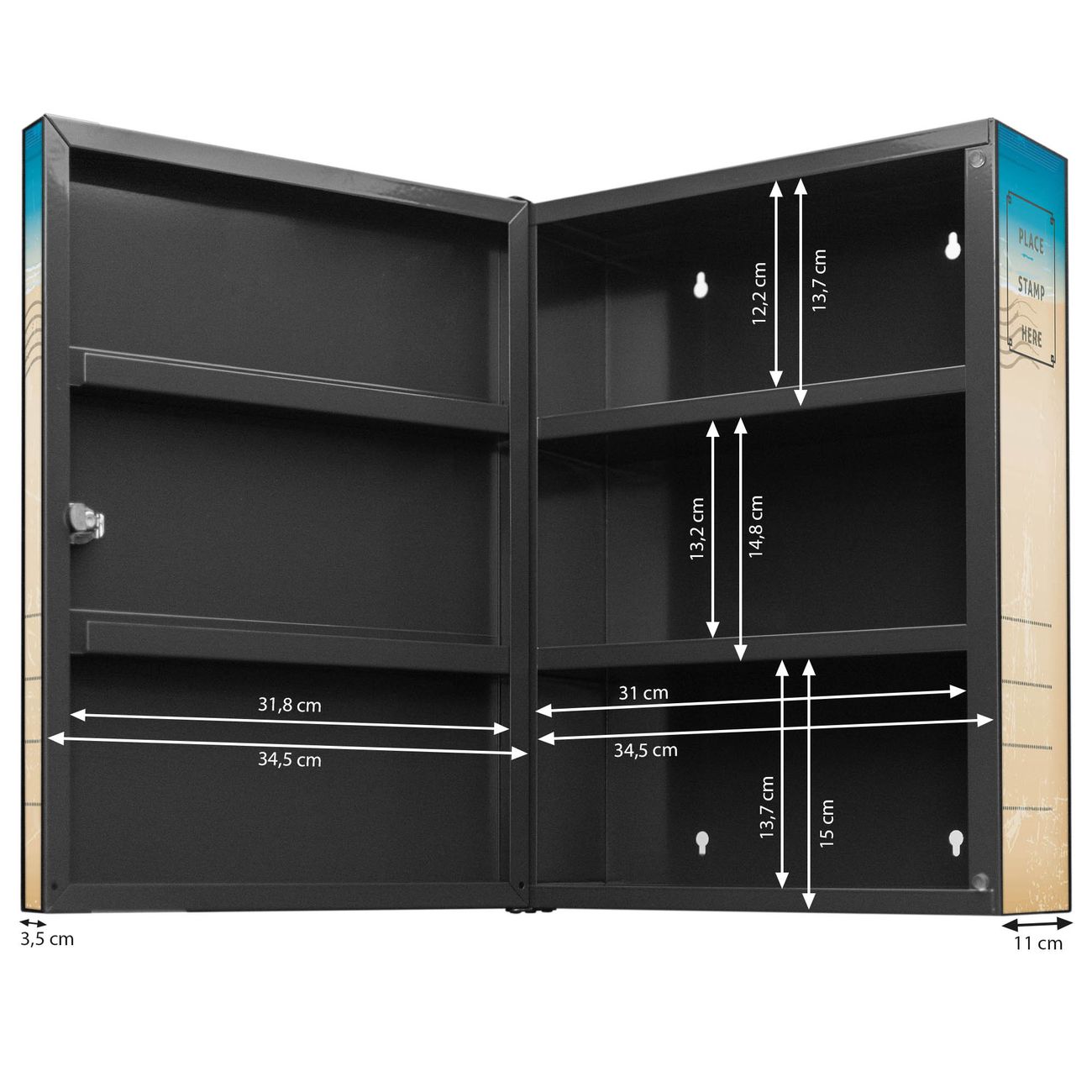Der Medizinschrank ist gesamt 35x46x15cm groß und wiegt ca. 3900g. Der Türanschlag ist links und kann nicht verändert werden, die Fronttür öffnet ca. 115°. Die Folierung befindet sich auf der Front und den Seiten. Das Gehäuse ist zeitlos anthrazit und aus Stahl gefertigt. Die innenliegenden Fächer haben verschiedene Größen für unterschiedliche Aufbewahrungsmöglichkeiten, in der Innentür können ebenfalls Dinge abgelegt werden. Befestigt wird der Medizinschrank an 4 Stellen auf der Rückseite, Sie erhalten 3 Schlüssel.