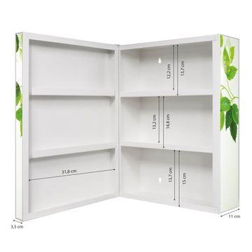 Der Medizinschrank ist gesamt 35x46x15cm groß und wiegt ca. 3900g. Der Türanschlag ist links und kann nicht verändert werden, die Fronttür öffnet ca. 115°. Die Folierung befindet sich auf der Front und den Seiten. Das Gehäuse ist zeitlos weiß und aus Stahl gefertigt. Die innenliegenden Fächer haben verschiedene Größen für unterschiedliche Aufbewahrungsmöglichkeiten, in der Innentür können ebenfalls Dinge abgelegt werden. Befestigt wird der Medizinschrank an 4 Stellen auf der Rückseite, Sie erhalten 3 Schlüssel.