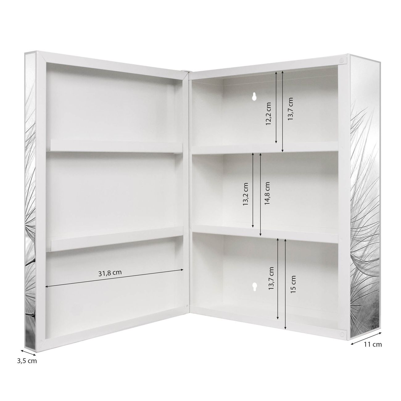 Der Medizinschrank ist gesamt 35x46x15cm groß und wiegt ca. 3900g. Der Türanschlag ist links und kann nicht verändert werden, die Fronttür öffnet ca. 115°. Die Folierung befindet sich auf der Front und den Seiten. Das Gehäuse ist zeitlos weiß und aus Stahl gefertigt. Die innenliegenden Fächer haben verschiedene Größen für unterschiedliche Aufbewahrungsmöglichkeiten, in der Innentür können ebenfalls Dinge abgelegt werden. Befestigt wird der Medizinschrank an 4 Stellen auf der Rückseite, Sie erhalten 3 Schlüssel.