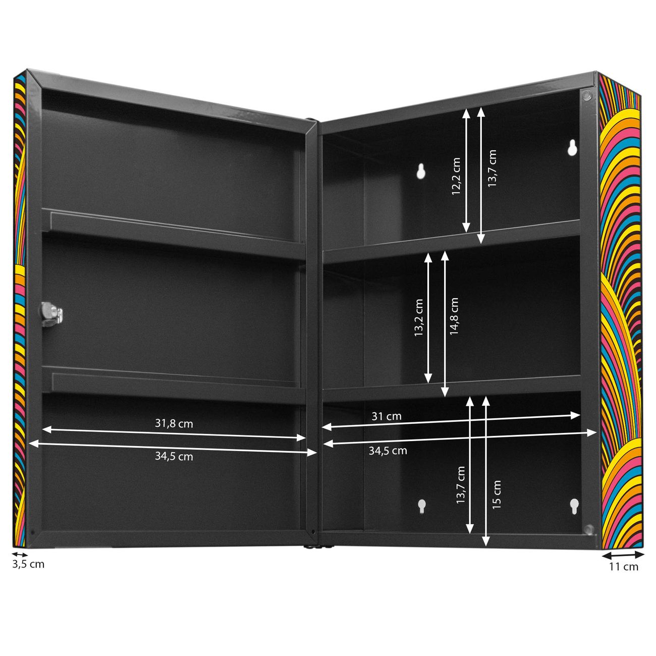 Der Medizinschrank ist gesamt 35x46x15cm groß und wiegt ca. 3900g. Der Türanschlag ist links und kann nicht verändert werden, die Fronttür öffnet ca. 115°. Die Folierung befindet sich auf der Front und den Seiten. Das Gehäuse ist zeitlos anthrazit und aus Stahl gefertigt. Die innenliegenden Fächer haben verschiedene Größen für unterschiedliche Aufbewahrungsmöglichkeiten, in der Innentür können ebenfalls Dinge abgelegt werden. Befestigt wird der Medizinschrank an 4 Stellen auf der Rückseite, Sie erhalten 3 Schlüssel.