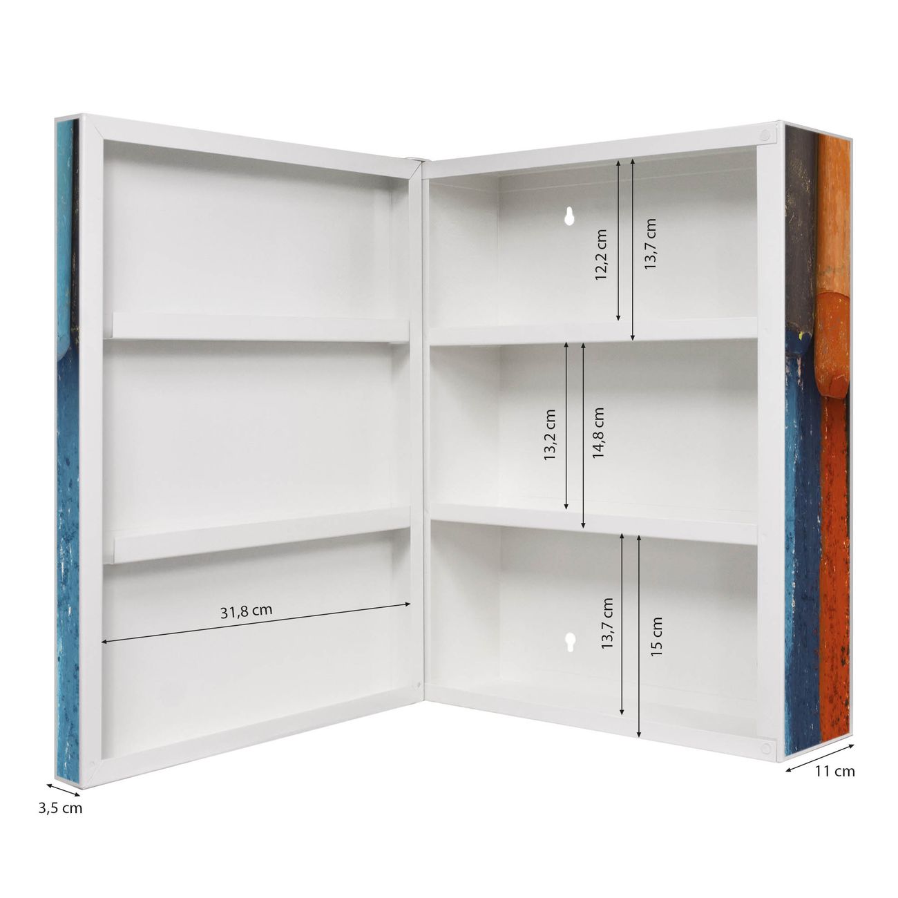 Der Medizinschrank ist gesamt 35x46x15cm groß und wiegt ca. 3900g. Der Türanschlag ist links und kann nicht verändert werden, die Fronttür öffnet ca. 115°. Die Folierung befindet sich auf der Front und den Seiten. Das Gehäuse ist zeitlos weiß und aus Stahl gefertigt. Die innenliegenden Fächer haben verschiedene Größen für unterschiedliche Aufbewahrungsmöglichkeiten, in der Innentür können ebenfalls Dinge abgelegt werden. Befestigt wird der Medizinschrank an 4 Stellen auf der Rückseite, Sie erhalten 3 Schlüssel.