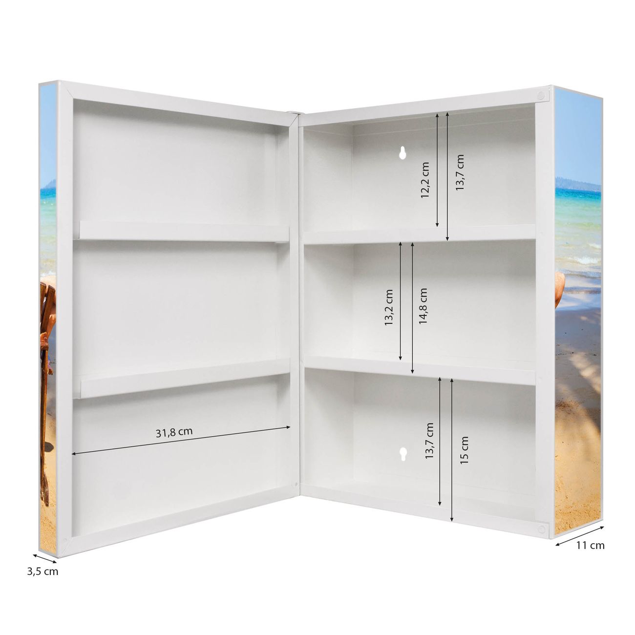 Der Medizinschrank ist gesamt 35x46x15cm groß und wiegt ca. 3900g. Der Türanschlag ist links und kann nicht verändert werden, die Fronttür öffnet ca. 115°. Die Folierung befindet sich auf der Front und den Seiten. Das Gehäuse ist zeitlos weiß und aus Stahl gefertigt. Die innenliegenden Fächer haben verschiedene Größen für unterschiedliche Aufbewahrungsmöglichkeiten, in der Innentür können ebenfalls Dinge abgelegt werden. Befestigt wird der Medizinschrank an 4 Stellen auf der Rückseite, Sie erhalten 3 Schlüssel.
