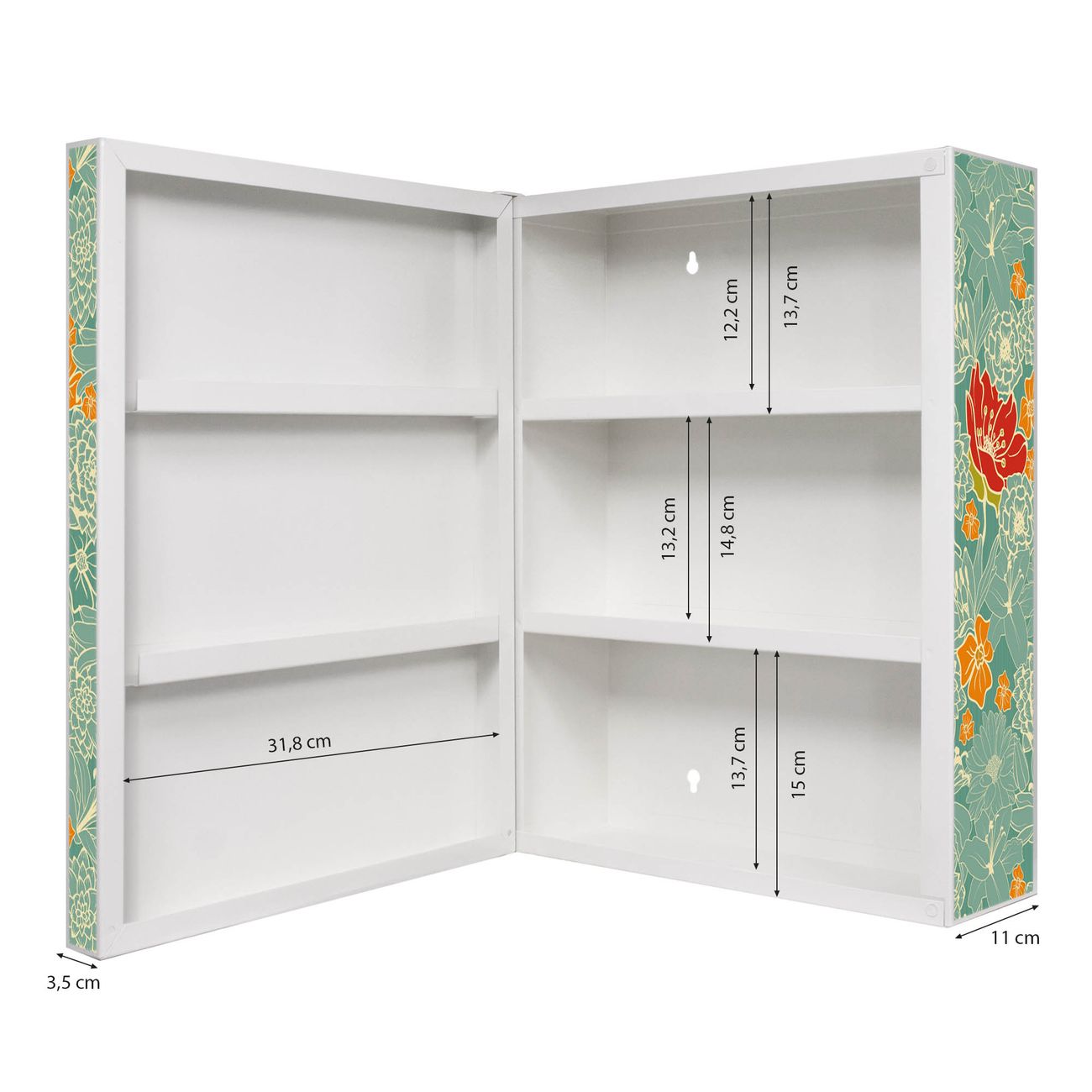 Der Medizinschrank ist gesamt 35x46x15cm groß und wiegt ca. 3900g. Der Türanschlag ist links und kann nicht verändert werden, die Fronttür öffnet ca. 115°. Die Folierung befindet sich auf der Front und den Seiten. Das Gehäuse ist zeitlos weiß und aus Stahl gefertigt. Die innenliegenden Fächer haben verschiedene Größen für unterschiedliche Aufbewahrungsmöglichkeiten, in der Innentür können ebenfalls Dinge abgelegt werden. Befestigt wird der Medizinschrank an 4 Stellen auf der Rückseite, Sie erhalten 3 Schlüssel.