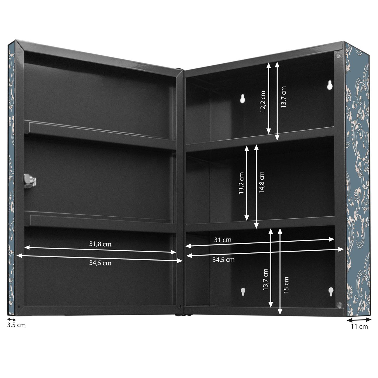 Der Medizinschrank ist gesamt 35x46x15cm groß und wiegt ca. 3900g. Der Türanschlag ist links und kann nicht verändert werden, die Fronttür öffnet ca. 115°. Die Folierung befindet sich auf der Front und den Seiten. Das Gehäuse ist zeitlos anthrazit und aus Stahl gefertigt. Die innenliegenden Fächer haben verschiedene Größen für unterschiedliche Aufbewahrungsmöglichkeiten, in der Innentür können ebenfalls Dinge abgelegt werden. Befestigt wird der Medizinschrank an 4 Stellen auf der Rückseite, Sie erhalten 3 Schlüssel.