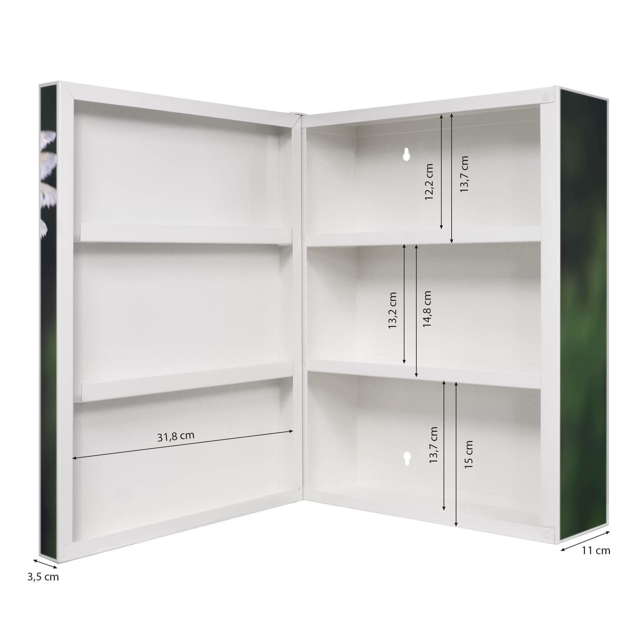 Der Medizinschrank ist gesamt 35x46x15cm groß und wiegt ca. 3900g. Der Türanschlag ist links und kann nicht verändert werden, die Fronttür öffnet ca. 115°. Die Folierung befindet sich auf der Front und den Seiten. Das Gehäuse ist zeitlos weiß und aus Stahl gefertigt. Die innenliegenden Fächer haben verschiedene Größen für unterschiedliche Aufbewahrungsmöglichkeiten, in der Innentür können ebenfalls Dinge abgelegt werden. Befestigt wird der Medizinschrank an 4 Stellen auf der Rückseite, Sie erhalten 3 Schlüssel.