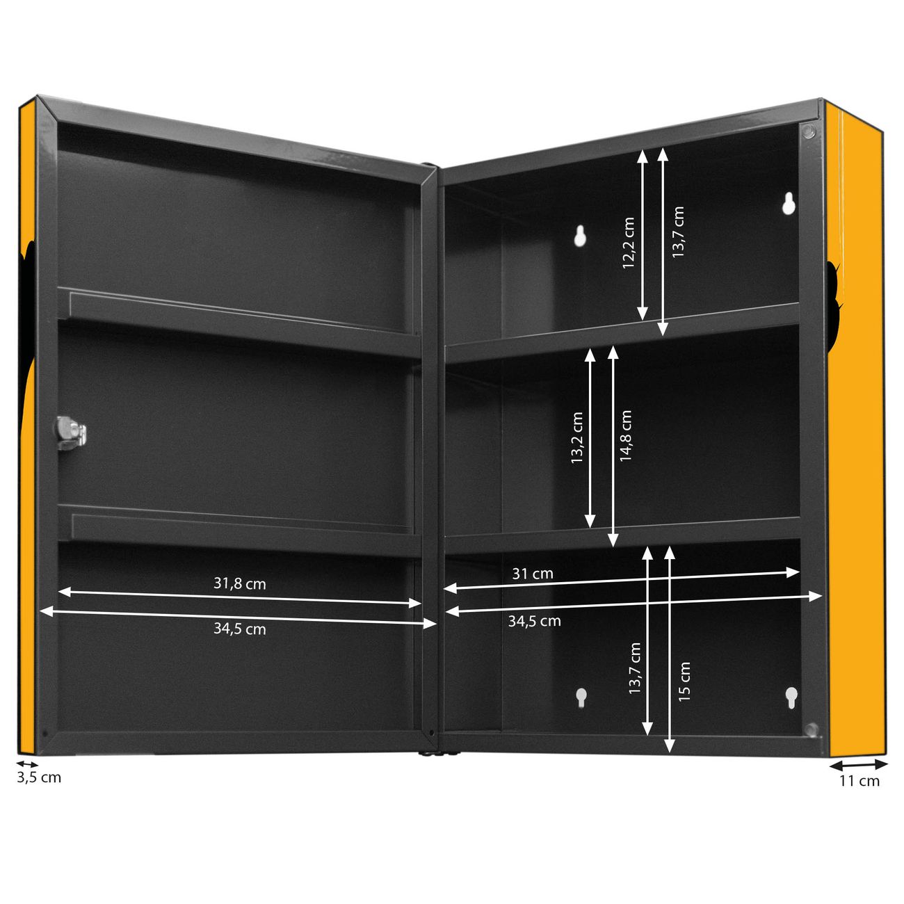 Der Medizinschrank ist gesamt 35x46x15cm groß und wiegt ca. 3900g. Der Türanschlag ist links und kann nicht verändert werden, die Fronttür öffnet ca. 115°. Die Folierung befindet sich auf der Front und den Seiten. Das Gehäuse ist zeitlos anthrazit und aus Stahl gefertigt. Die innenliegenden Fächer haben verschiedene Größen für unterschiedliche Aufbewahrungsmöglichkeiten, in der Innentür können ebenfalls Dinge abgelegt werden. Befestigt wird der Medizinschrank an 4 Stellen auf der Rückseite, Sie erhalten 3 Schlüssel.