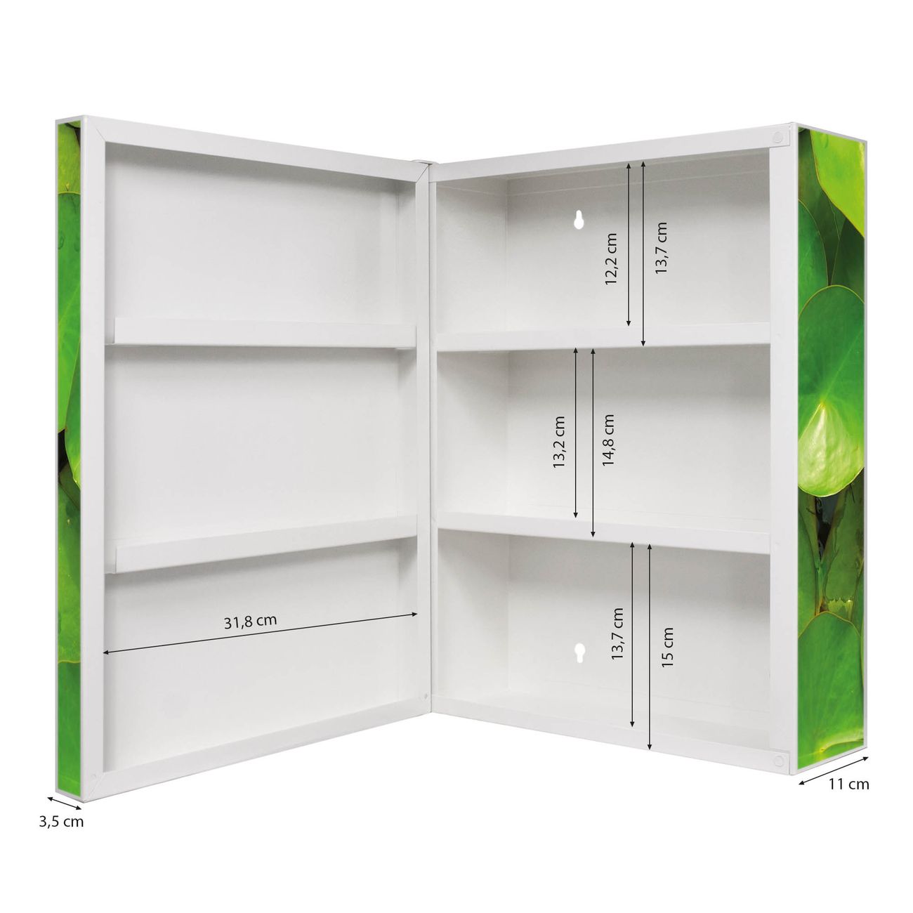 Der Medizinschrank ist gesamt 35x46x15cm groß und wiegt ca. 3900g. Der Türanschlag ist links und kann nicht verändert werden, die Fronttür öffnet ca. 115°. Die Folierung befindet sich auf der Front und den Seiten. Das Gehäuse ist zeitlos weiß und aus Stahl gefertigt. Die innenliegenden Fächer haben verschiedene Größen für unterschiedliche Aufbewahrungsmöglichkeiten, in der Innentür können ebenfalls Dinge abgelegt werden. Befestigt wird der Medizinschrank an 4 Stellen auf der Rückseite, Sie erhalten 3 Schlüssel.