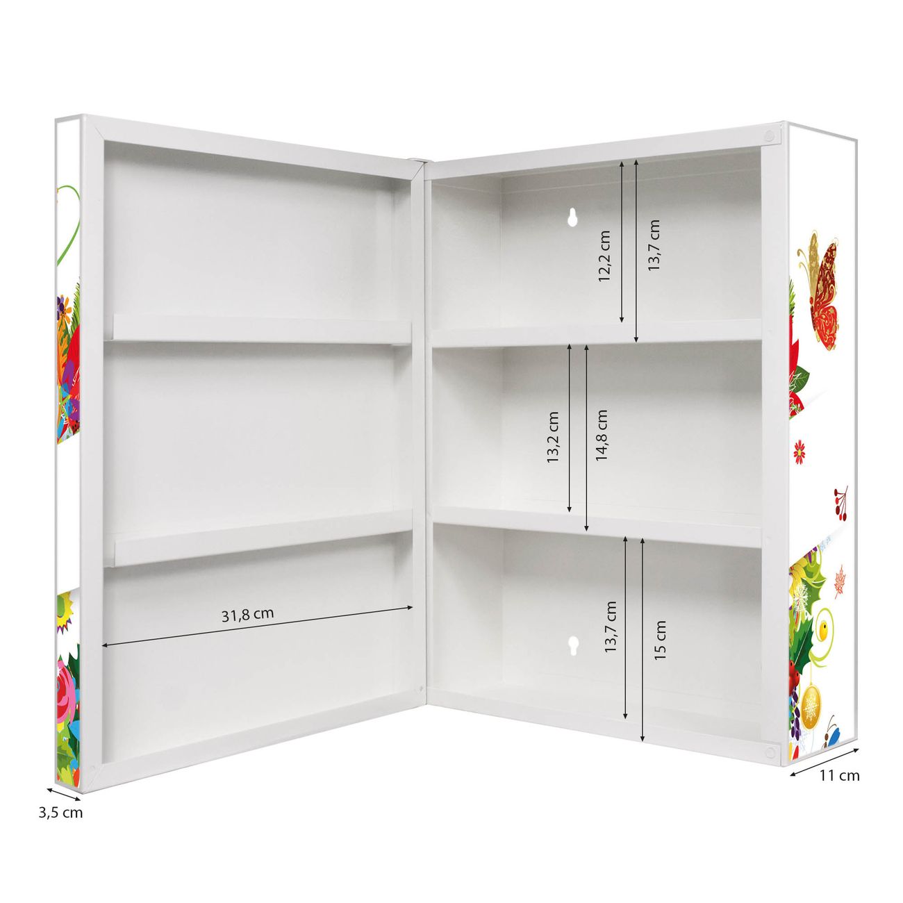 Der Medizinschrank ist gesamt 35x46x15cm groß und wiegt ca. 3900g. Der Türanschlag ist links und kann nicht verändert werden, die Fronttür öffnet ca. 115°. Die Folierung befindet sich auf der Front und den Seiten. Das Gehäuse ist zeitlos weiß und aus Stahl gefertigt. Die innenliegenden Fächer haben verschiedene Größen für unterschiedliche Aufbewahrungsmöglichkeiten, in der Innentür können ebenfalls Dinge abgelegt werden. Befestigt wird der Medizinschrank an 4 Stellen auf der Rückseite, Sie erhalten 3 Schlüssel.