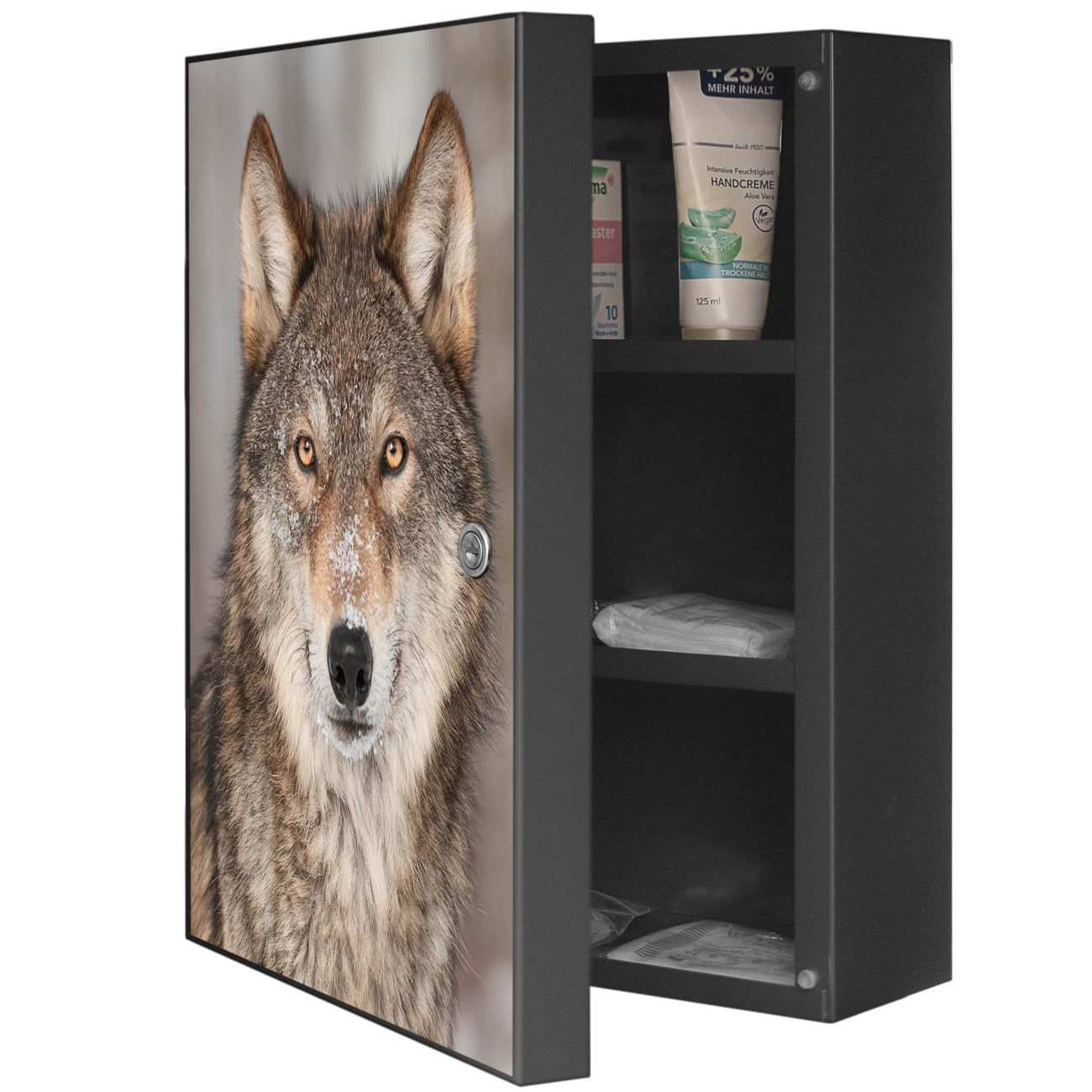 Der Medizinschrank ist gesamt 35x46x15cm groß und wiegt ca. 3900g. Der Türanschlag ist links und kann nicht verändert werden, die Fronttür öffnet ca. 115°. Die Folierung befindet sich auf der Front. Das Gehäuse ist zeitlos anthrazit und aus Stahl gefertigt. Die innenliegenden Fächer haben verschiedene Größen für unterschiedliche Aufbewahrungsmöglichkeiten, in der Innentür können ebenfalls Dinge abgelegt werden. Befestigt wird der Medizinschrank an 4 Stellen auf der Rückseite, Sie erhalten 3 Schlüssel.