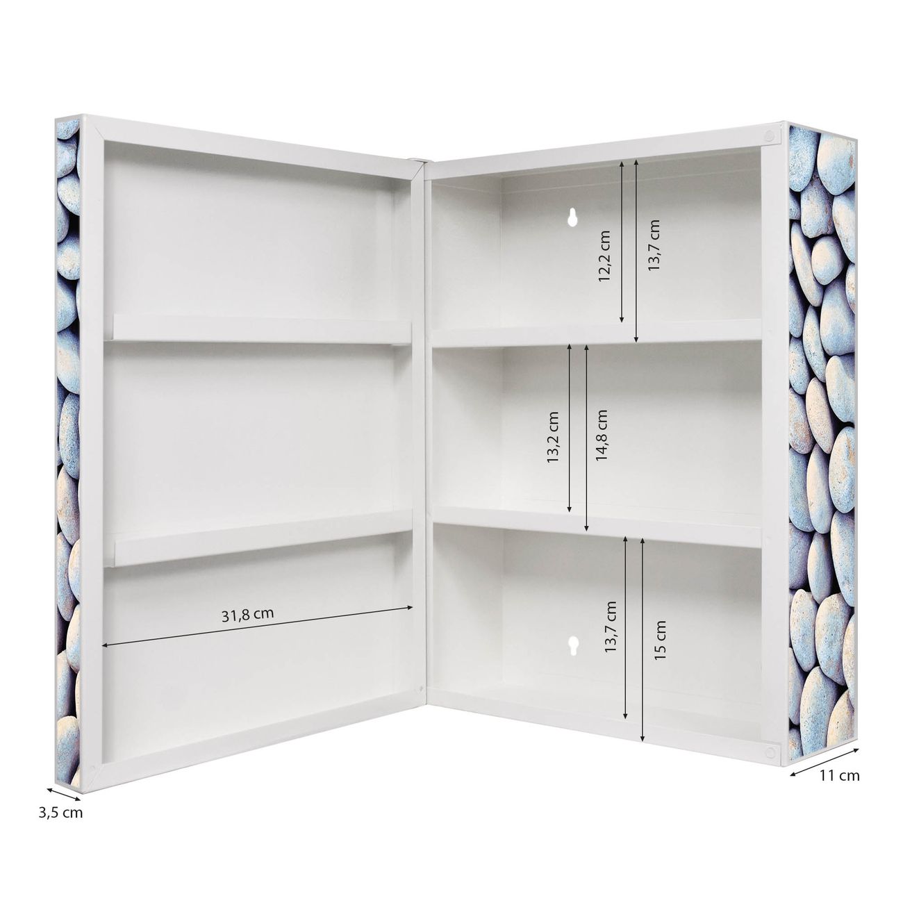 Der Medizinschrank ist gesamt 35x46x15cm groß und wiegt ca. 3900g. Der Türanschlag ist links und kann nicht verändert werden, die Fronttür öffnet ca. 115°. Die Folierung befindet sich auf der Front und den Seiten. Das Gehäuse ist zeitlos weiß und aus Stahl gefertigt. Die innenliegenden Fächer haben verschiedene Größen für unterschiedliche Aufbewahrungsmöglichkeiten, in der Innentür können ebenfalls Dinge abgelegt werden. Befestigt wird der Medizinschrank an 4 Stellen auf der Rückseite, Sie erhalten 3 Schlüssel.