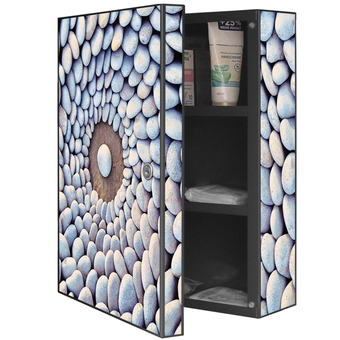 Der Medizinschrank ist gesamt 35x46x15cm groß und wiegt ca. 3900g. Der Türanschlag ist links und kann nicht verändert werden, die Fronttür öffnet ca. 115°. Die Folierung befindet sich auf der Front und den Seiten. Das Gehäuse ist zeitlos anthrazit und aus Stahl gefertigt. Die innenliegenden Fächer haben verschiedene Größen für unterschiedliche Aufbewahrungsmöglichkeiten, in der Innentür können ebenfalls Dinge abgelegt werden. Befestigt wird der Medizinschrank an 4 Stellen auf der Rückseite, Sie erhalten 3 Schlüssel.