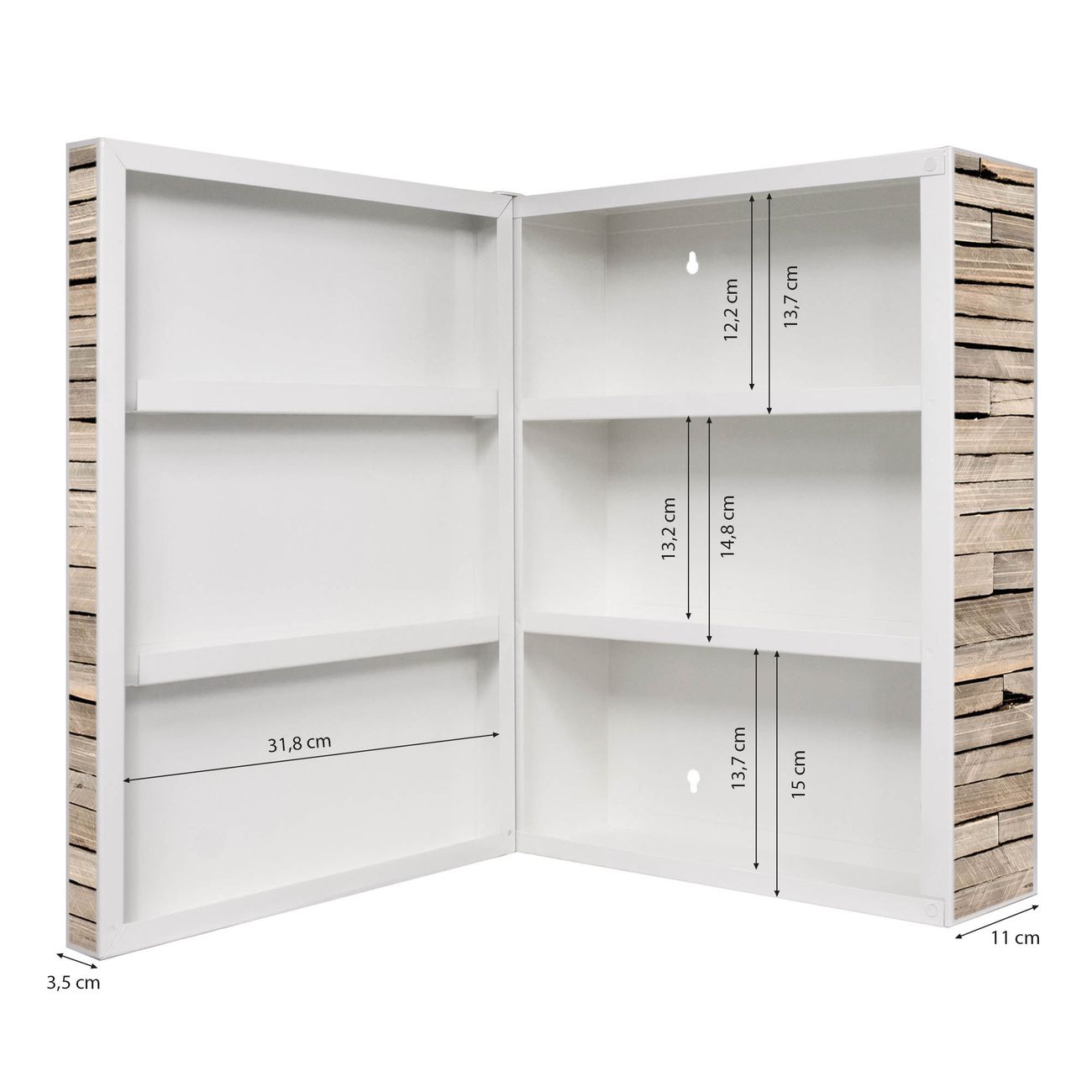 Der Medizinschrank ist gesamt 35x46x15cm groß und wiegt ca. 3900g. Der Türanschlag ist links und kann nicht verändert werden, die Fronttür öffnet ca. 115°. Die Folierung befindet sich auf der Front und den Seiten. Das Gehäuse ist zeitlos weiß und aus Stahl gefertigt. Die innenliegenden Fächer haben verschiedene Größen für unterschiedliche Aufbewahrungsmöglichkeiten, in der Innentür können ebenfalls Dinge abgelegt werden. Befestigt wird der Medizinschrank an 4 Stellen auf der Rückseite, Sie erhalten 3 Schlüssel.