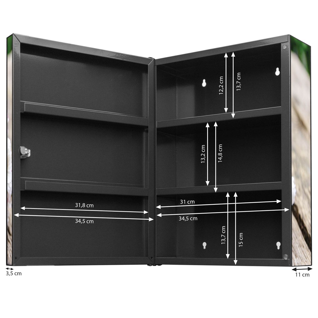 Der Medizinschrank ist gesamt 35x46x15cm groß und wiegt ca. 3900g. Der Türanschlag ist links und kann nicht verändert werden, die Fronttür öffnet ca. 115°. Die Folierung befindet sich auf der Front und den Seiten. Das Gehäuse ist zeitlos anthrazit und aus Stahl gefertigt. Die innenliegenden Fächer haben verschiedene Größen für unterschiedliche Aufbewahrungsmöglichkeiten, in der Innentür können ebenfalls Dinge abgelegt werden. Befestigt wird der Medizinschrank an 4 Stellen auf der Rückseite, Sie erhalten 3 Schlüssel.