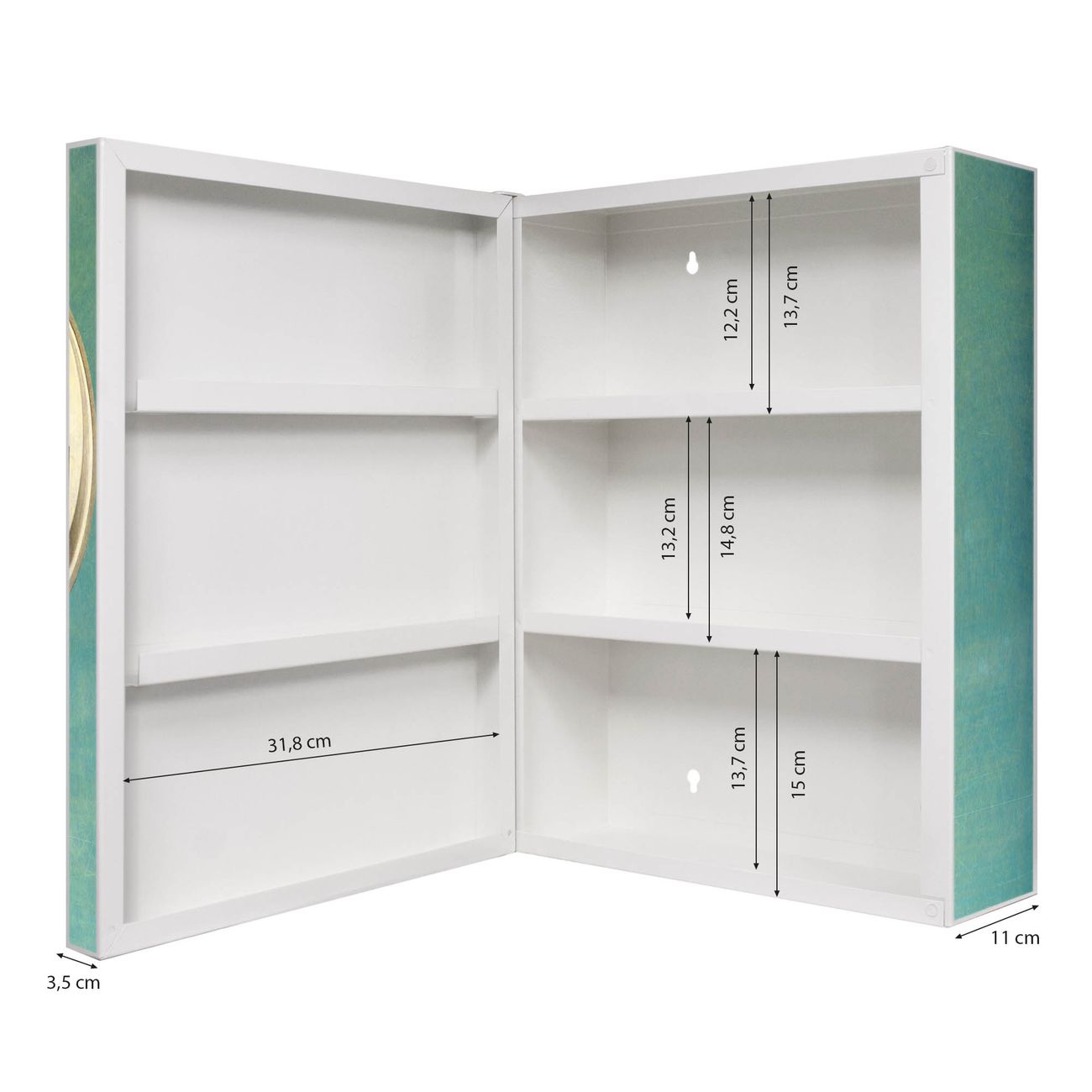 Der Medizinschrank ist gesamt 35x46x15cm groß und wiegt ca. 3900g. Der Türanschlag ist links und kann nicht verändert werden, die Fronttür öffnet ca. 115°. Die Folierung befindet sich auf der Front und den Seiten. Das Gehäuse ist zeitlos weiß und aus Stahl gefertigt. Die innenliegenden Fächer haben verschiedene Größen für unterschiedliche Aufbewahrungsmöglichkeiten, in der Innentür können ebenfalls Dinge abgelegt werden. Befestigt wird der Medizinschrank an 4 Stellen auf der Rückseite, Sie erhalten 3 Schlüssel.