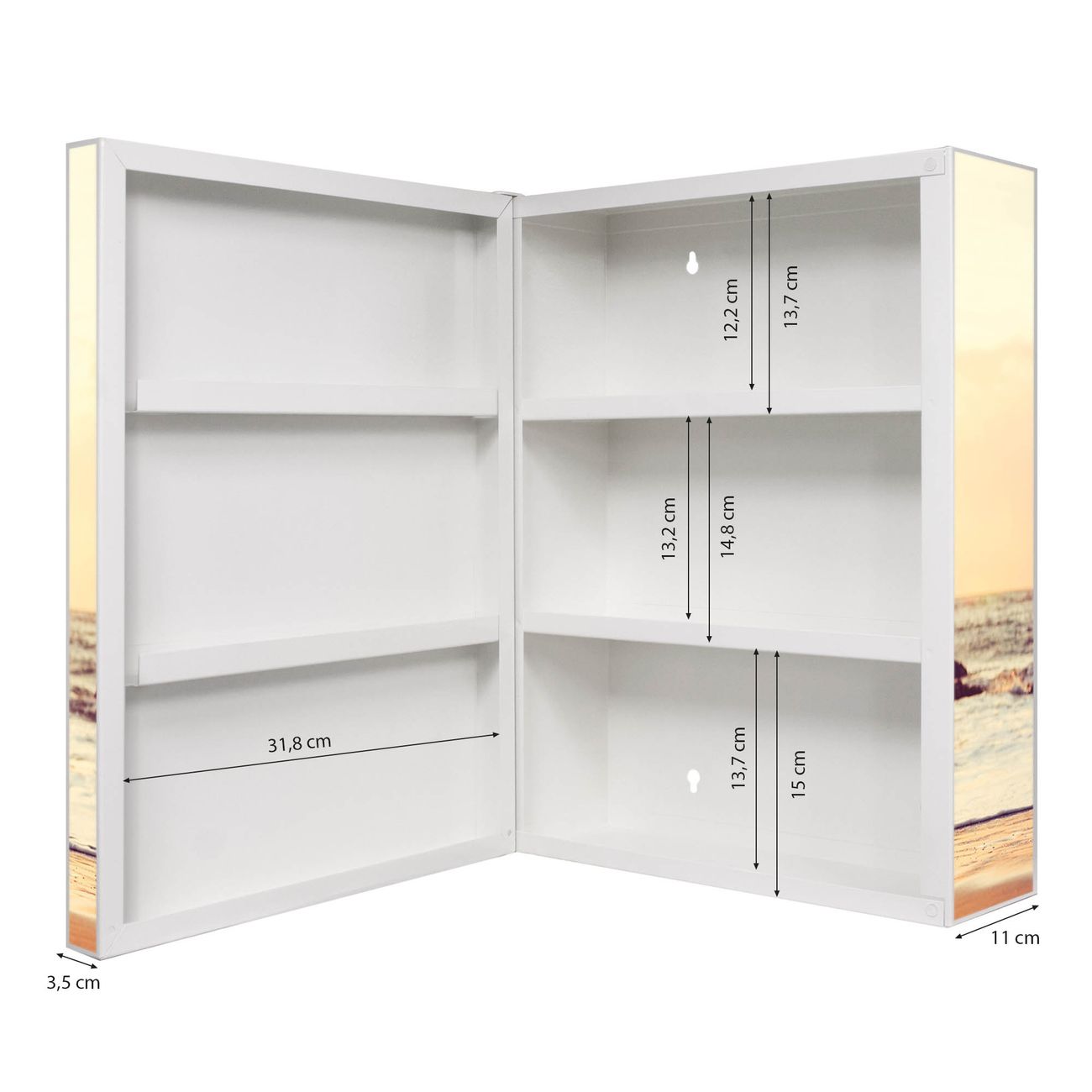 Der Medizinschrank ist gesamt 35x46x15cm groß und wiegt ca. 3900g. Der Türanschlag ist links und kann nicht verändert werden, die Fronttür öffnet ca. 115°. Die Folierung befindet sich auf der Front und den Seiten. Das Gehäuse ist zeitlos weiß und aus Stahl gefertigt. Die innenliegenden Fächer haben verschiedene Größen für unterschiedliche Aufbewahrungsmöglichkeiten, in der Innentür können ebenfalls Dinge abgelegt werden. Befestigt wird der Medizinschrank an 4 Stellen auf der Rückseite, Sie erhalten 3 Schlüssel.