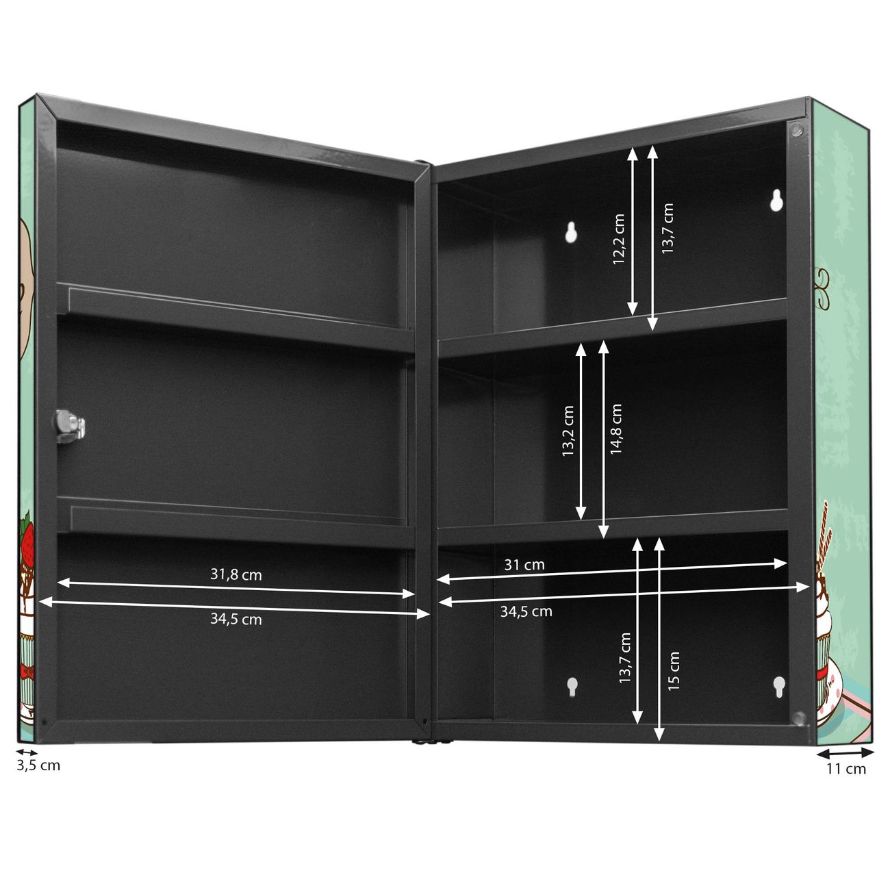 Der Medizinschrank ist gesamt 35x46x15cm groß und wiegt ca. 3900g. Der Türanschlag ist links und kann nicht verändert werden, die Fronttür öffnet ca. 115°. Die Folierung befindet sich auf der Front und den Seiten. Das Gehäuse ist zeitlos anthrazit und aus Stahl gefertigt. Die innenliegenden Fächer haben verschiedene Größen für unterschiedliche Aufbewahrungsmöglichkeiten, in der Innentür können ebenfalls Dinge abgelegt werden. Befestigt wird der Medizinschrank an 4 Stellen auf der Rückseite, Sie erhalten 3 Schlüssel.