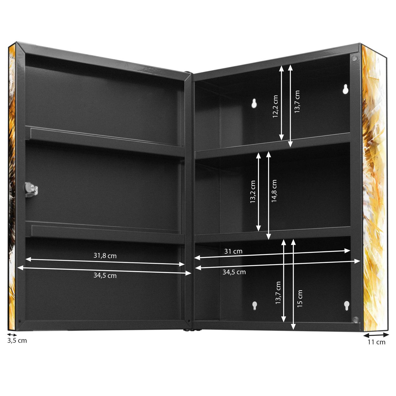 Der Medizinschrank ist gesamt 35x46x15cm groß und wiegt ca. 3900g. Der Türanschlag ist links und kann nicht verändert werden, die Fronttür öffnet ca. 115°. Die Folierung befindet sich auf der Front und den Seiten. Das Gehäuse ist zeitlos anthrazit und aus Stahl gefertigt. Die innenliegenden Fächer haben verschiedene Größen für unterschiedliche Aufbewahrungsmöglichkeiten, in der Innentür können ebenfalls Dinge abgelegt werden. Befestigt wird der Medizinschrank an 4 Stellen auf der Rückseite, Sie erhalten 3 Schlüssel.