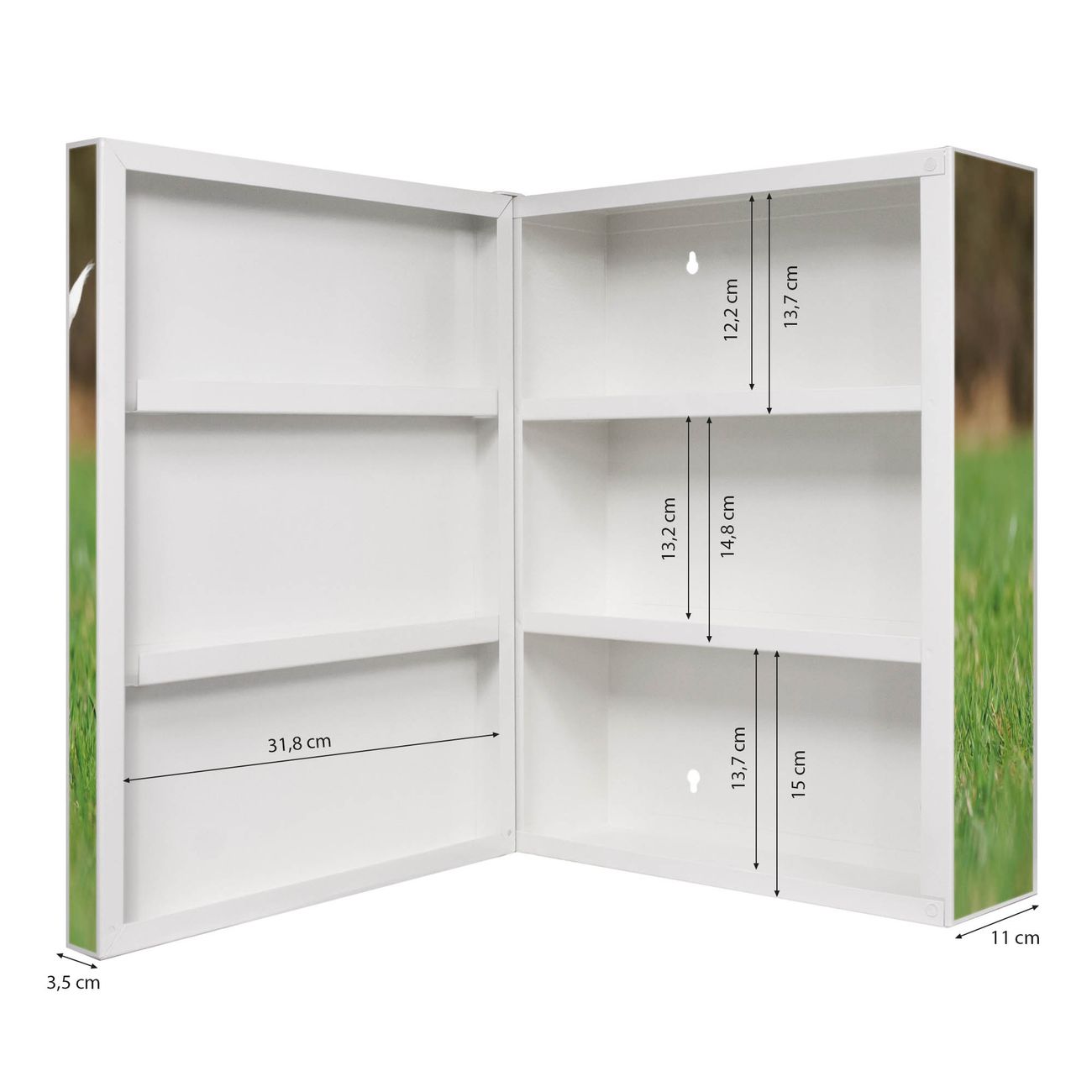 Der Medizinschrank ist gesamt 35x46x15cm groß und wiegt ca. 3900g. Der Türanschlag ist links und kann nicht verändert werden, die Fronttür öffnet ca. 115°. Die Folierung befindet sich auf der Front und den Seiten. Das Gehäuse ist zeitlos weiß und aus Stahl gefertigt. Die innenliegenden Fächer haben verschiedene Größen für unterschiedliche Aufbewahrungsmöglichkeiten, in der Innentür können ebenfalls Dinge abgelegt werden. Befestigt wird der Medizinschrank an 4 Stellen auf der Rückseite, Sie erhalten 3 Schlüssel.