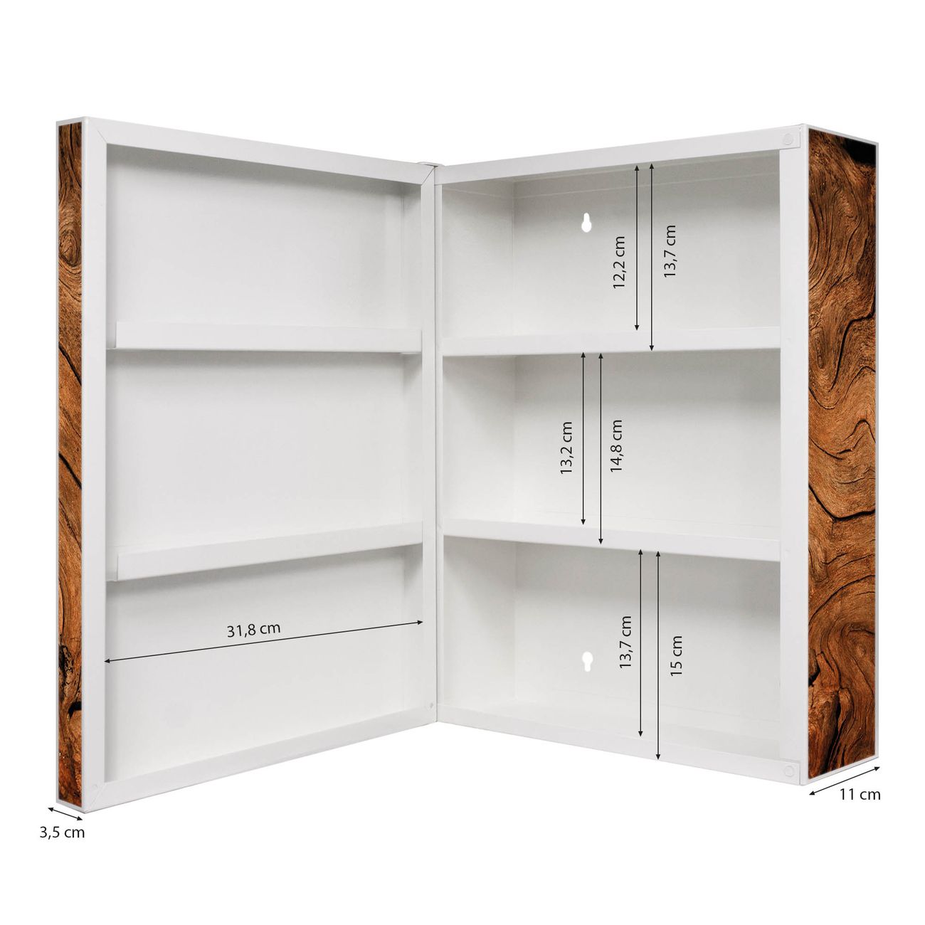 Der Medizinschrank ist gesamt 35x46x15cm groß und wiegt ca. 3900g. Der Türanschlag ist links und kann nicht verändert werden, die Fronttür öffnet ca. 115°. Die Folierung befindet sich auf der Front und den Seiten. Das Gehäuse ist zeitlos weiß und aus Stahl gefertigt. Die innenliegenden Fächer haben verschiedene Größen für unterschiedliche Aufbewahrungsmöglichkeiten, in der Innentür können ebenfalls Dinge abgelegt werden. Befestigt wird der Medizinschrank an 4 Stellen auf der Rückseite, Sie erhalten 3 Schlüssel.