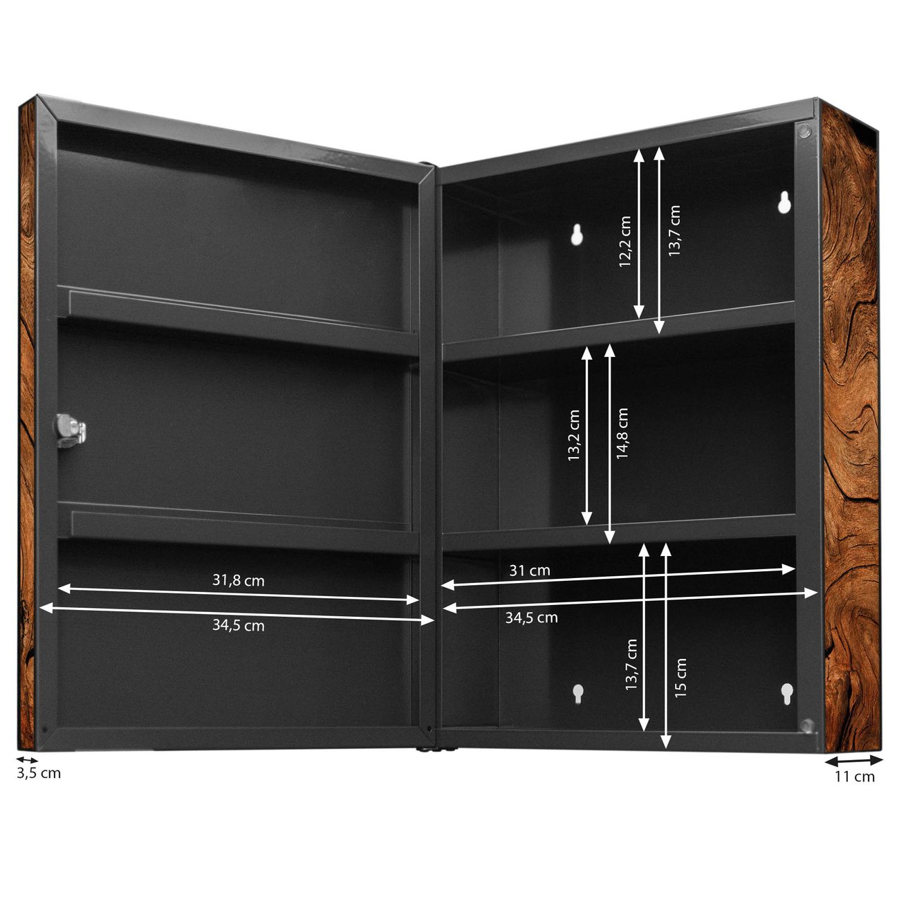 Der Medizinschrank ist gesamt 35x46x15cm groß und wiegt ca. 3900g. Der Türanschlag ist links und kann nicht verändert werden, die Fronttür öffnet ca. 115°. Die Folierung befindet sich auf der Front und den Seiten. Das Gehäuse ist zeitlos anthrazit und aus Stahl gefertigt. Die innenliegenden Fächer haben verschiedene Größen für unterschiedliche Aufbewahrungsmöglichkeiten, in der Innentür können ebenfalls Dinge abgelegt werden. Befestigt wird der Medizinschrank an 4 Stellen auf der Rückseite, Sie erhalten 3 Schlüssel.