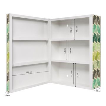 Der Medizinschrank ist gesamt 35x46x15cm groß und wiegt ca. 3900g. Der Türanschlag ist links und kann nicht verändert werden, die Fronttür öffnet ca. 115°. Die Folierung befindet sich auf der Front und den Seiten. Das Gehäuse ist zeitlos weiß und aus Stahl gefertigt. Die innenliegenden Fächer haben verschiedene Größen für unterschiedliche Aufbewahrungsmöglichkeiten, in der Innentür können ebenfalls Dinge abgelegt werden. Befestigt wird der Medizinschrank an 4 Stellen auf der Rückseite, Sie erhalten 3 Schlüssel.