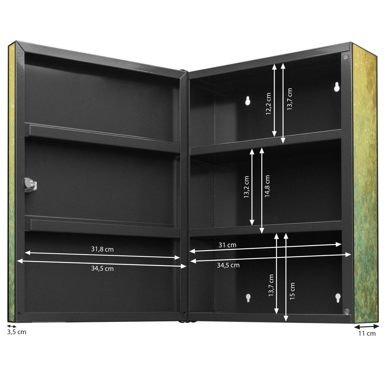 Der Medizinschrank ist gesamt 35x46x15cm groß und wiegt ca. 3900g. Der Türanschlag ist links und kann nicht verändert werden, die Fronttür öffnet ca. 115°. Die Folierung befindet sich auf der Front und den Seiten. Das Gehäuse ist zeitlos anthrazit und aus Stahl gefertigt. Die innenliegenden Fächer haben verschiedene Größen für unterschiedliche Aufbewahrungsmöglichkeiten, in der Innentür können ebenfalls Dinge abgelegt werden. Befestigt wird der Medizinschrank an 4 Stellen auf der Rückseite, Sie erhalten 3 Schlüssel.