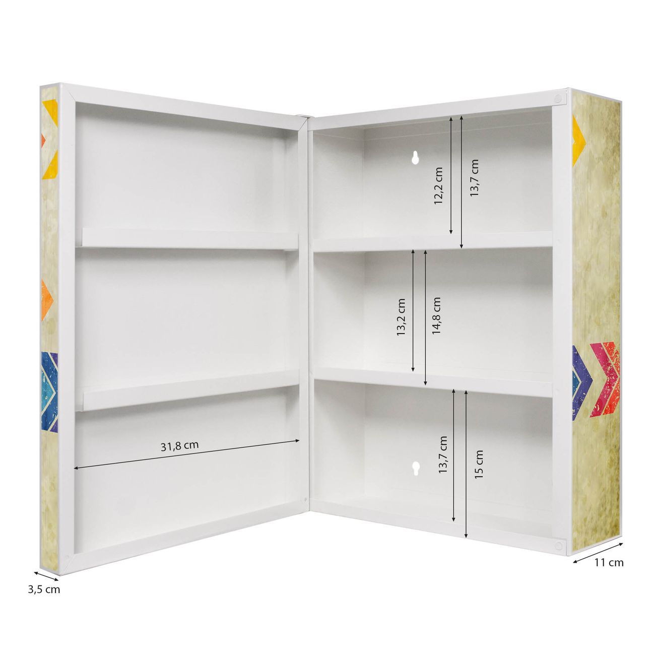 Der Medizinschrank ist gesamt 35x46x15cm groß und wiegt ca. 3900g. Der Türanschlag ist links und kann nicht verändert werden, die Fronttür öffnet ca. 115°. Die Folierung befindet sich auf der Front und den Seiten. Das Gehäuse ist zeitlos weiß und aus Stahl gefertigt. Die innenliegenden Fächer haben verschiedene Größen für unterschiedliche Aufbewahrungsmöglichkeiten, in der Innentür können ebenfalls Dinge abgelegt werden. Befestigt wird der Medizinschrank an 4 Stellen auf der Rückseite, Sie erhalten 3 Schlüssel.