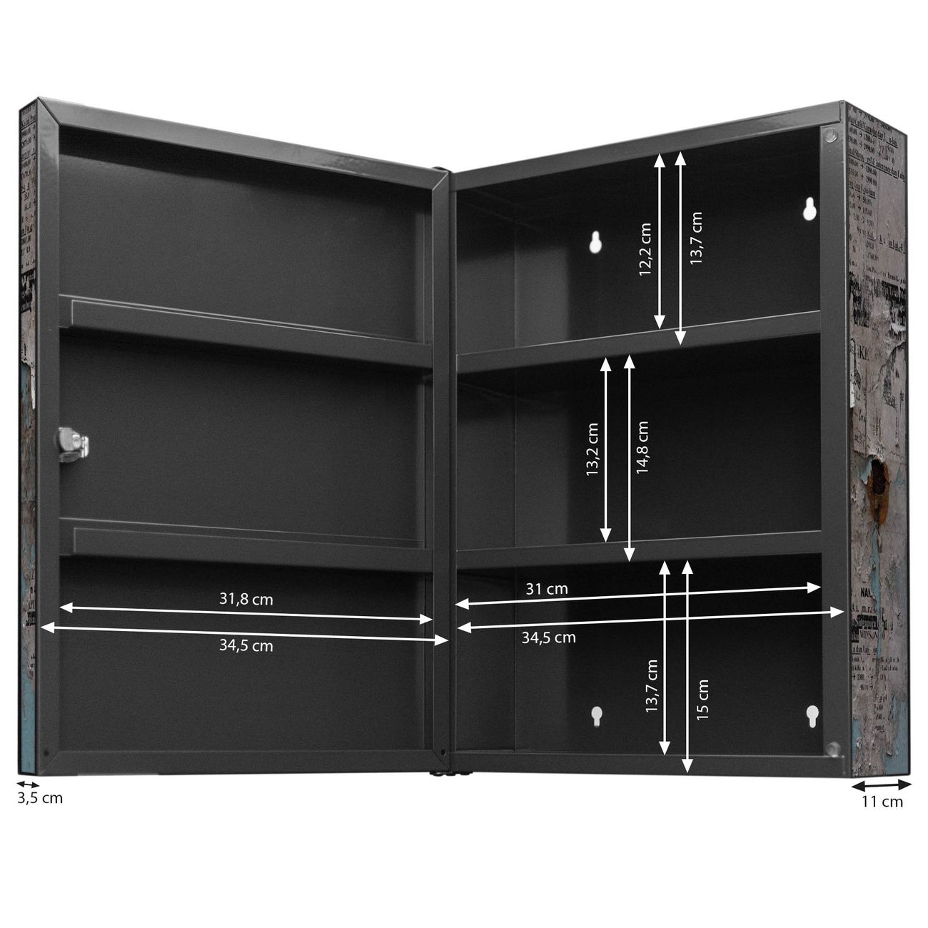 Der Medizinschrank ist gesamt 35x46x15cm groß und wiegt ca. 3900g. Der Türanschlag ist links und kann nicht verändert werden, die Fronttür öffnet ca. 115°. Die Folierung befindet sich auf der Front und den Seiten. Das Gehäuse ist zeitlos anthrazit und aus Stahl gefertigt. Die innenliegenden Fächer haben verschiedene Größen für unterschiedliche Aufbewahrungsmöglichkeiten, in der Innentür können ebenfalls Dinge abgelegt werden. Befestigt wird der Medizinschrank an 4 Stellen auf der Rückseite, Sie erhalten 3 Schlüssel.