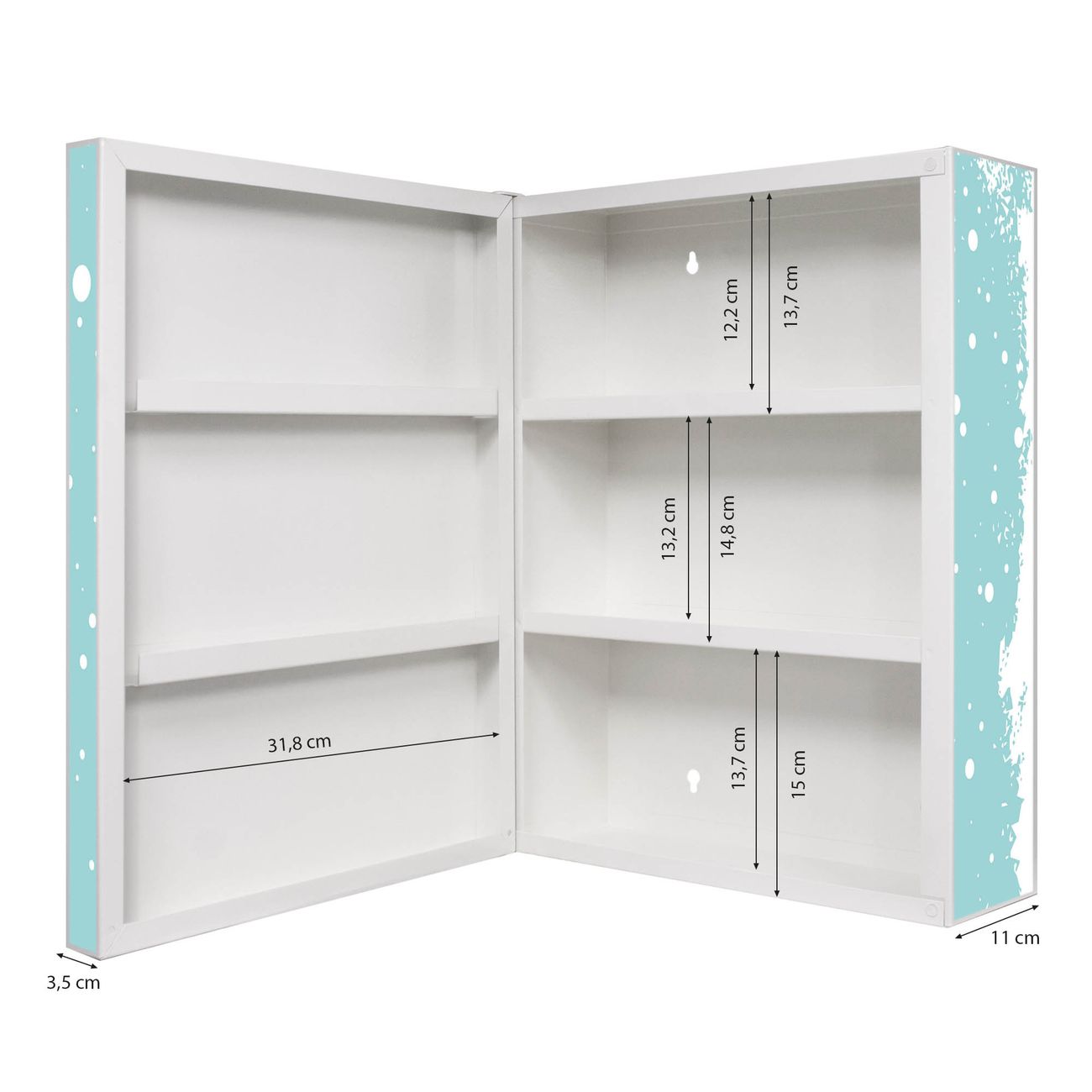 Der Medizinschrank ist gesamt 35x46x15cm groß und wiegt ca. 3900g. Der Türanschlag ist links und kann nicht verändert werden, die Fronttür öffnet ca. 115°. Die Folierung befindet sich auf der Front und den Seiten. Das Gehäuse ist zeitlos weiß und aus Stahl gefertigt. Die innenliegenden Fächer haben verschiedene Größen für unterschiedliche Aufbewahrungsmöglichkeiten, in der Innentür können ebenfalls Dinge abgelegt werden. Befestigt wird der Medizinschrank an 4 Stellen auf der Rückseite, Sie erhalten 3 Schlüssel.