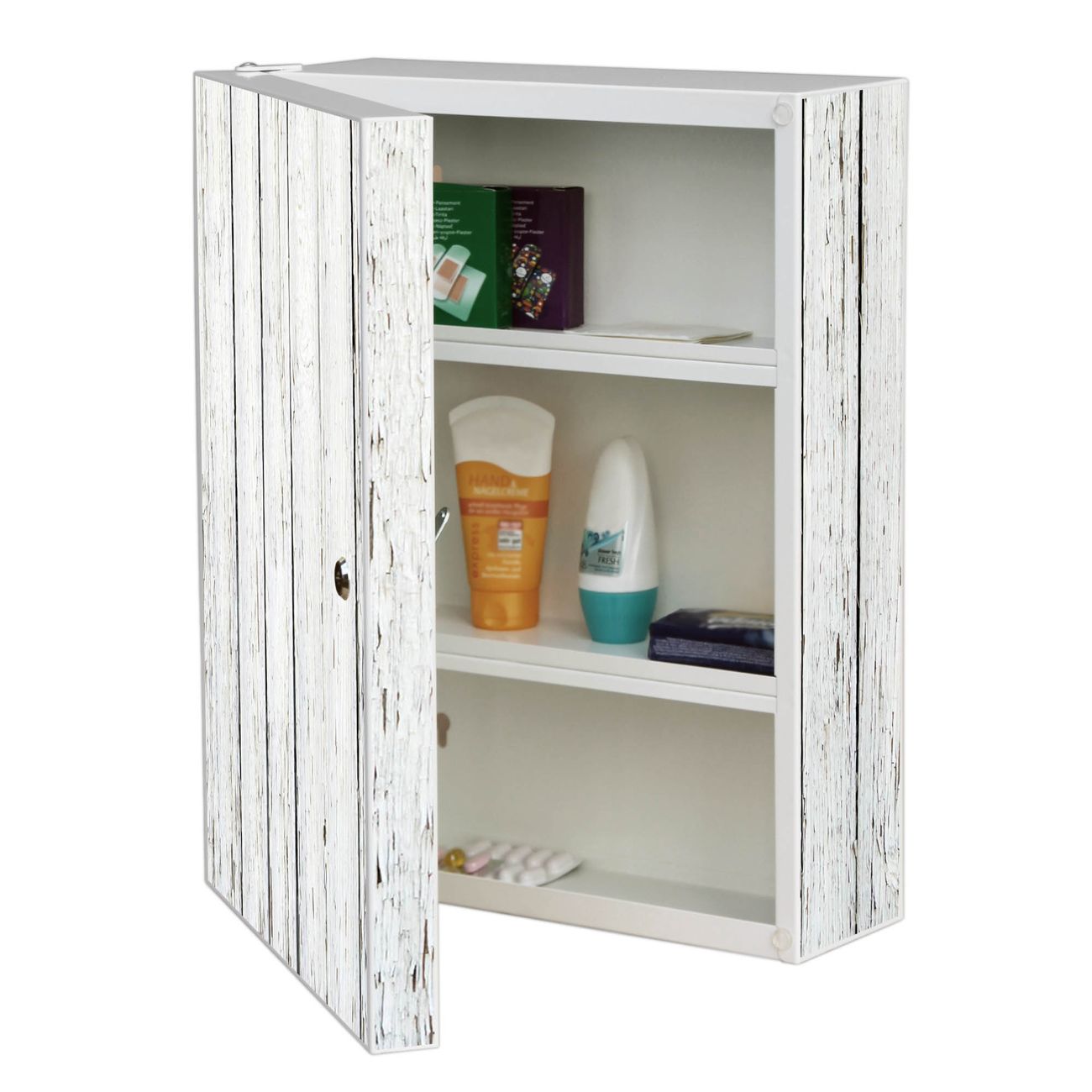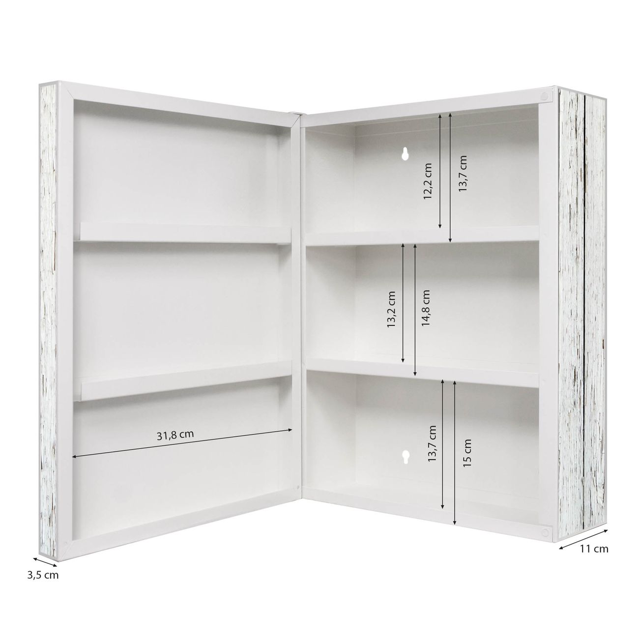 Der Medizinschrank ist gesamt 35x46x15cm groß und wiegt ca. 3900g. Der Türanschlag ist links und kann nicht verändert werden, die Fronttür öffnet ca. 115°. Die Folierung befindet sich auf der Front und den Seiten. Das Gehäuse ist zeitlos weiß und aus Stahl gefertigt. Die innenliegenden Fächer haben verschiedene Größen für unterschiedliche Aufbewahrungsmöglichkeiten, in der Innentür können ebenfalls Dinge abgelegt werden. Befestigt wird der Medizinschrank an 4 Stellen auf der Rückseite, Sie erhalten 3 Schlüssel.